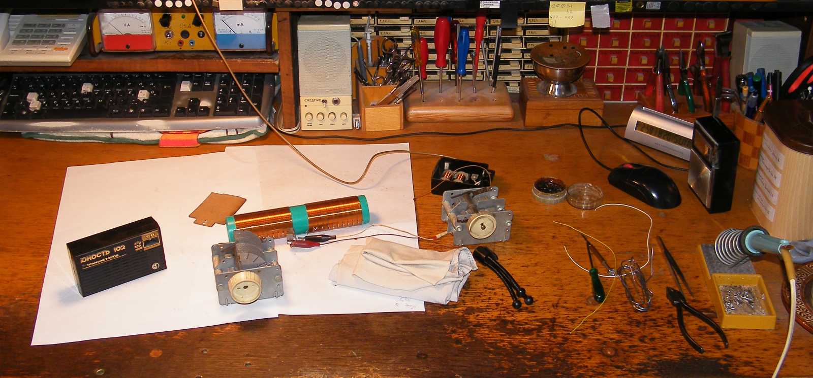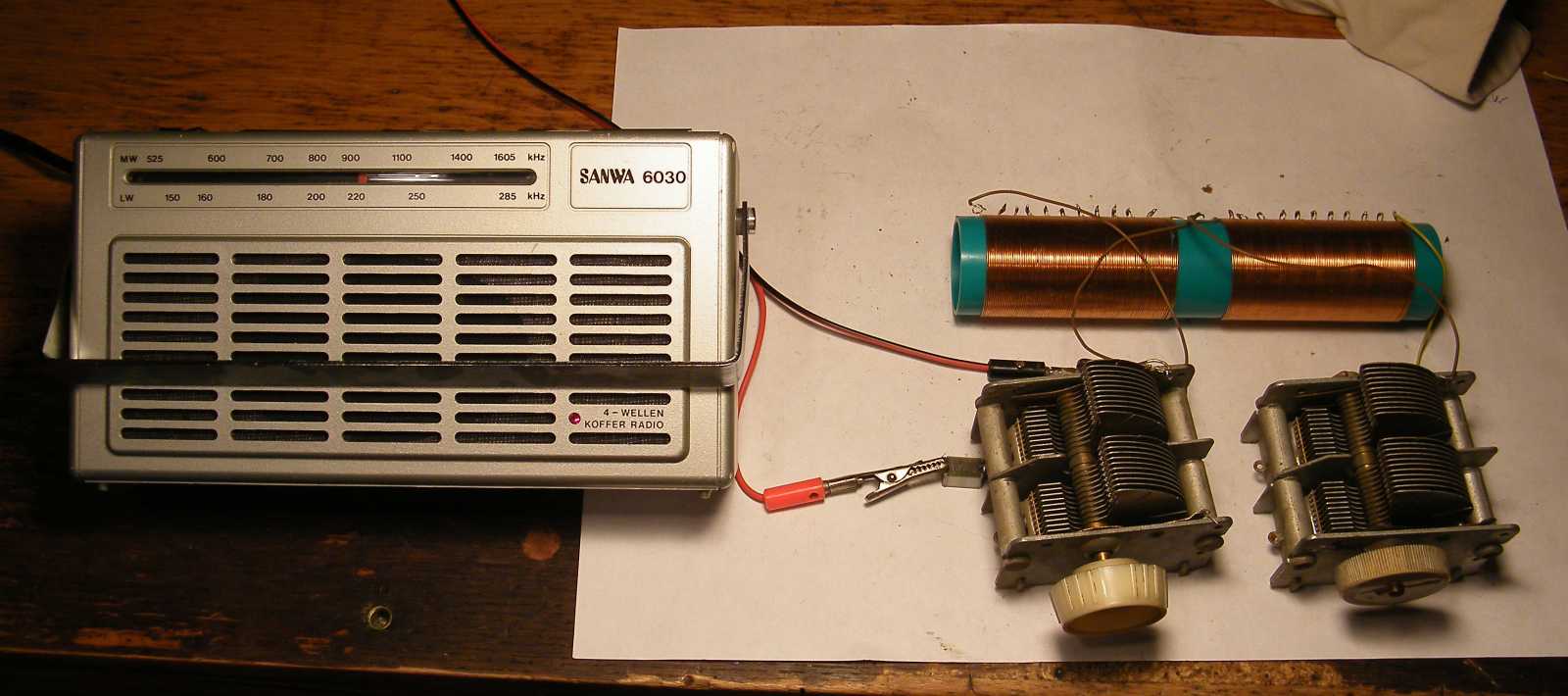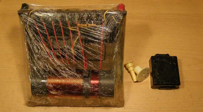 impulzusok gerjesztenek. A nagyfrekvenciát az impulzusok által gerjesztett, a forgókondenzátorral hangolható rezgőkör szolgáltatja, miközben az alacsony frekvenciás komponens, vagyis a zümmer alaphangja a modulációt biztosítja. A vevő pedig egy egyenes rendszerű Junoszty 102-es szovjet építőkészlet. |