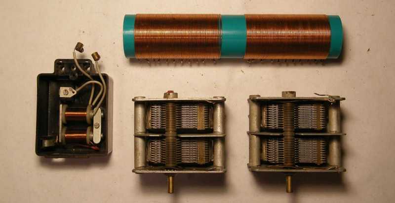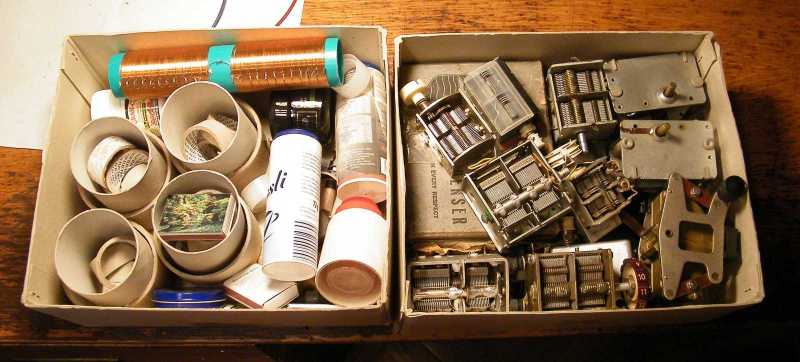 Íme a pusztán az elv működésének bemutatására szolgáló szikraadóhoz szükséges alkatrészek sora. A tekercsnek természetesen nem kell duplának lennie, mint ahogy forgókondenzátorból sem szükséges kettő, és ha csak egy van, még annak sem kell kettősnek lennie. Mivel a hatalmas forgókondenzátorok tengelyeit puszta kézzel egy kissé nehéz forgatni, így az akadályoztatásom okán mondtam rájuk valami csúnyát. |