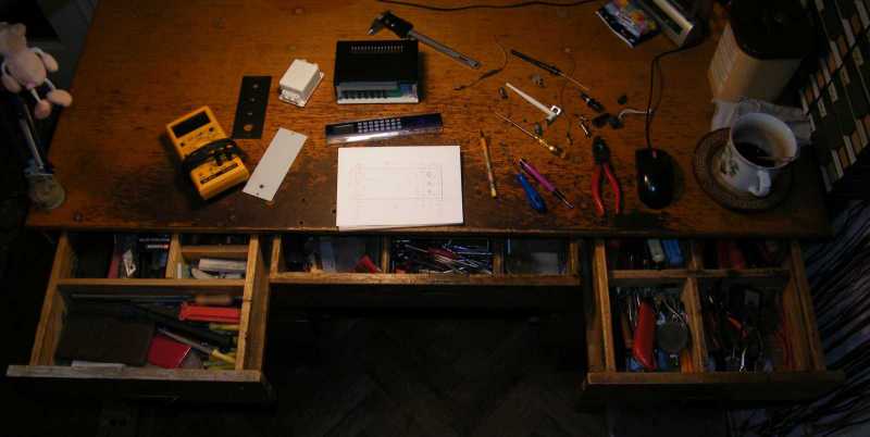 Azt a kijelentésemet viszont nagyon is komolyan gondoltam, hogy az asztaltól egészen addig nem állok fel, míg csak meg nem terveztem az előlapot! A hely amúgy nemcsak holmi tervezésre, de akár még arra is alkalmas, hogy az előlapot itt, pláne egy ültő helyemben legyártsam, csak a porszívót kellene idehúznom. Régen ez amúgy így volt. Mármint mindent itt intéztem a hallban az asztalnál, a pincébe csak a nagyon nagy volumenű építésekkel (például mélyláda) mentem le. |