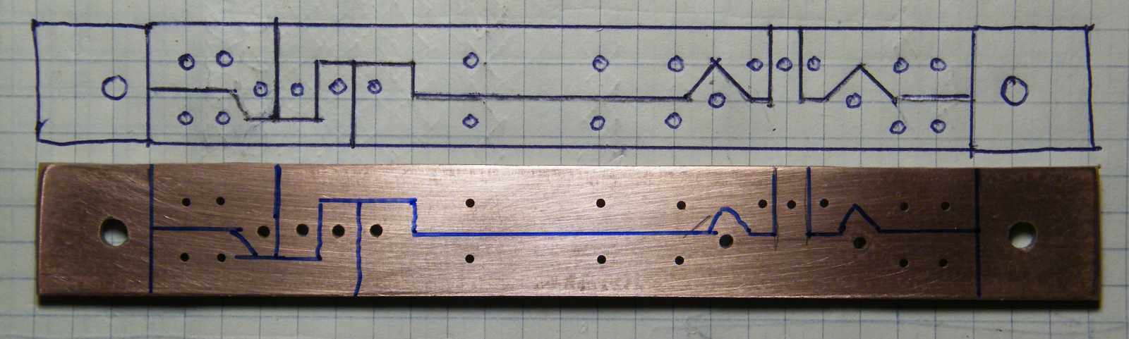 Miután a már felesleges szerszámokat rendre elrakosgattam, a panelt a fény felé fordítva újra megnéztem. Elsőre nagyon meglepett, de aztán még az ebédet követő kajakóma közben is viszonylag gyorsan rájöttem, hogy fordítva nézem. A lényeg persze csak az, hogy minden vágási vonal végigfut, így nincs rajta rövidzárlat. |