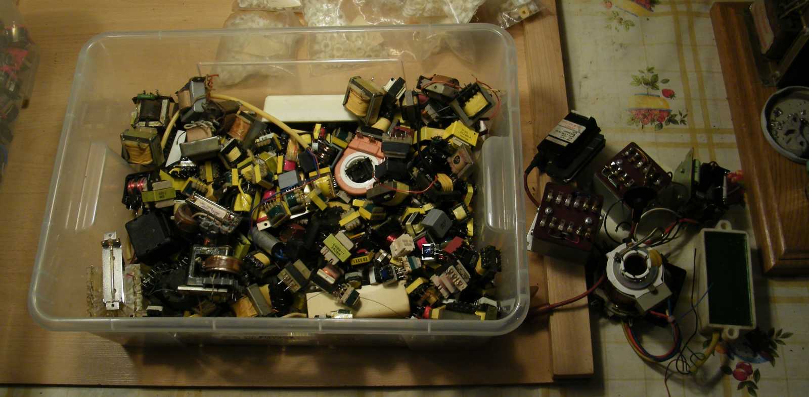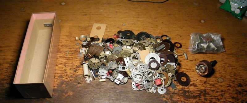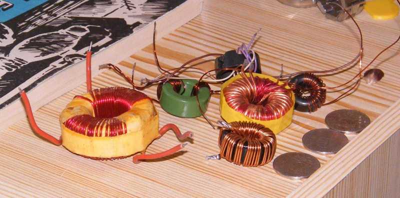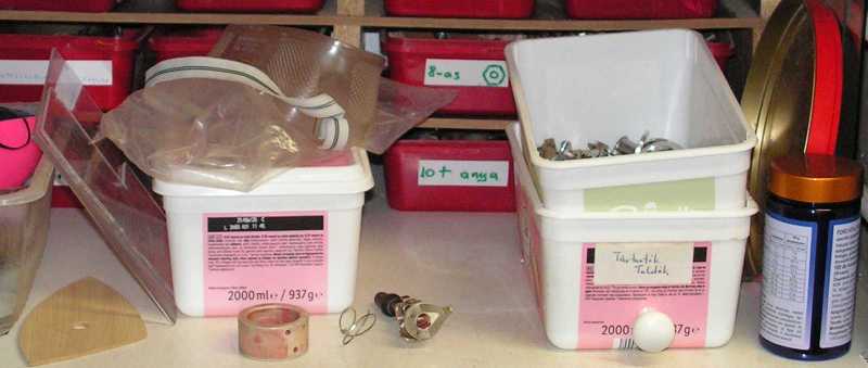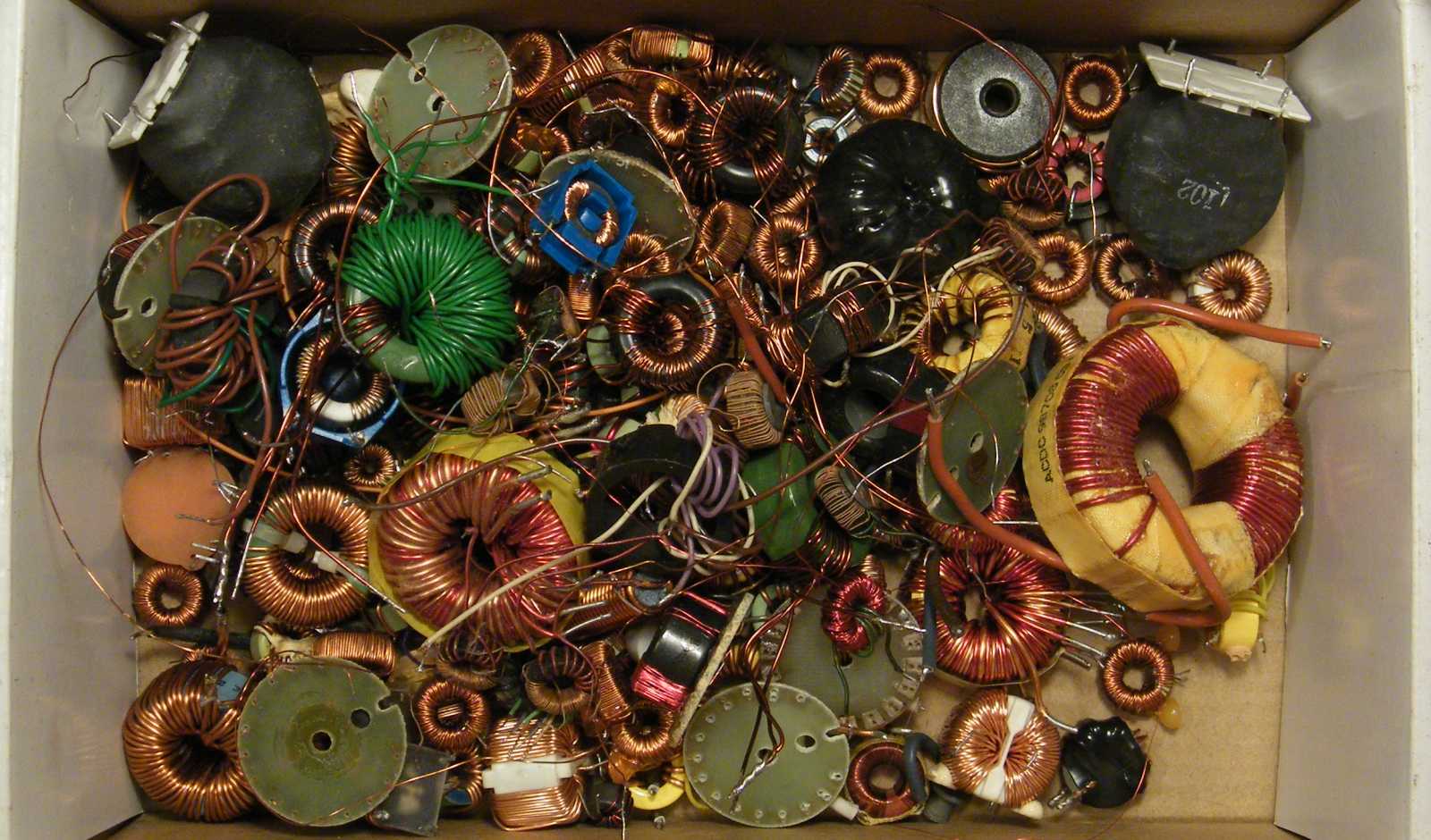 Miközben az induktivitások megvalósításához előtúrt vasakat az asztalnál ülve rendezgettem, idővel kezdett hiányérzetem lenni. Mármint annak tekintetében, hogy a gyűrűvasaim AL értékét még nem mértem le. Kisvártatva már magukat a gyűrűvasakat hiányoltam, aminek az lett a vége, hogy lejöttem hozzájuk ide a pincébe, ahol is ha magamat azért nem is (de csak mert a kialakult kuplerájt illetően óvatosságból inkább nem néztem körbe), de a vasmagos dobozt könyörtelenül kiborítottam. |
