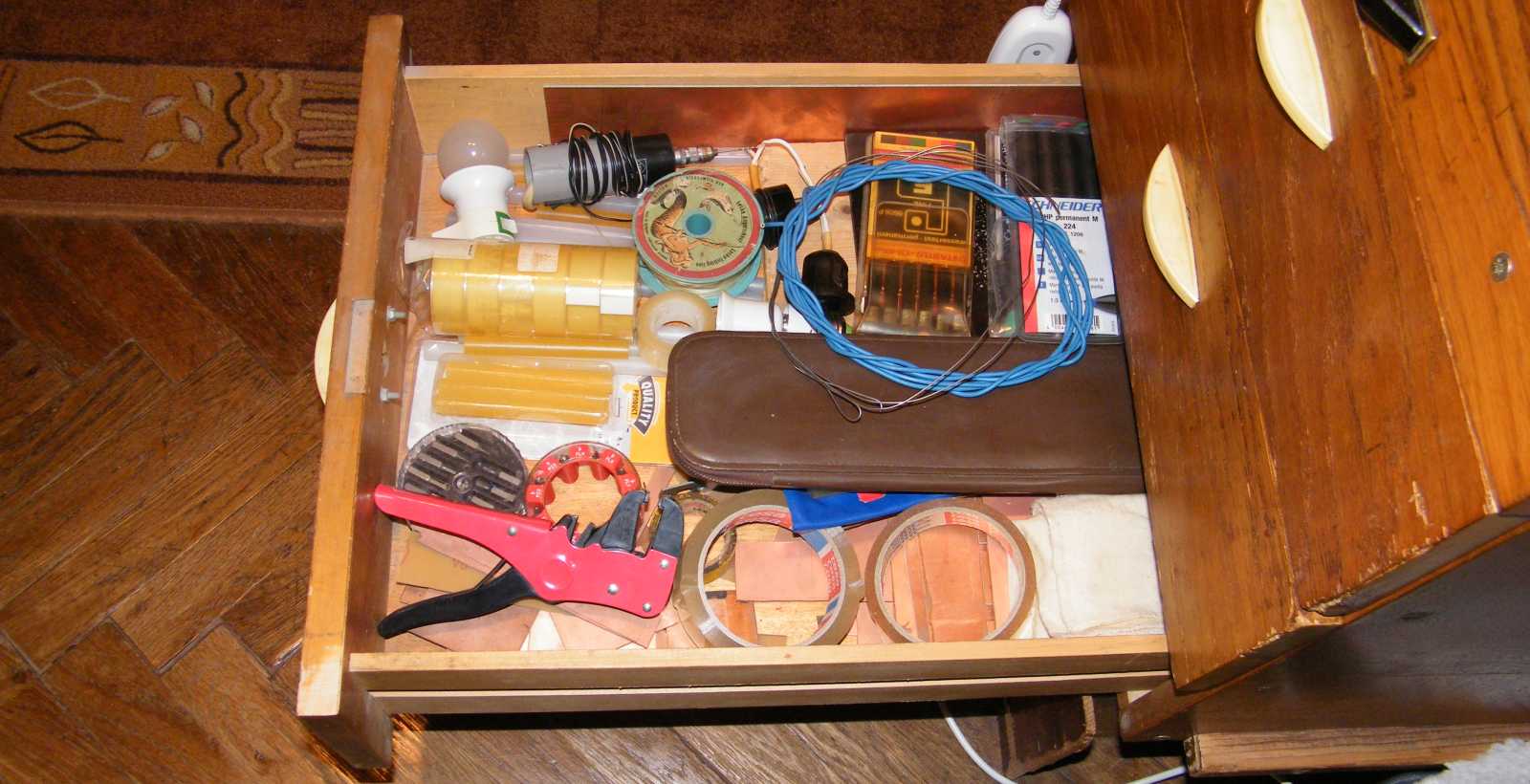 Miközben épp nagyban az ágyban hevertem, azon járt az eszem, hogy a képen látható fiókból mégis hova a csudába tűnhetett a damil. Mint az felül és középen látható, az bizony nem ment innen sehova, épp csak az emlékezetemből esett ki. Mármint az, hogy még mindig itt van. Ezt a fiókot is mióta rendbe kellene már tennem... Már ha csak ez már nem egy rendbetett állapot, mert akkor nem szóltam! |