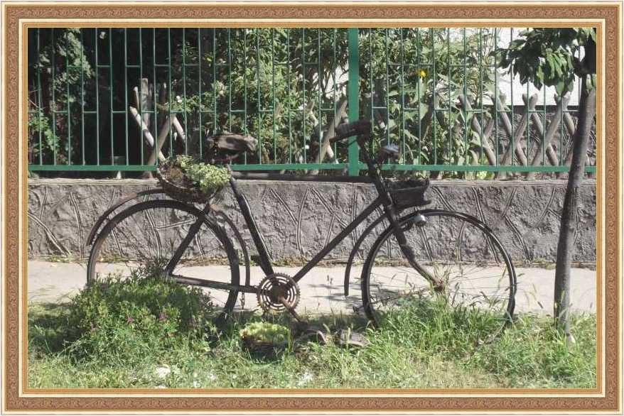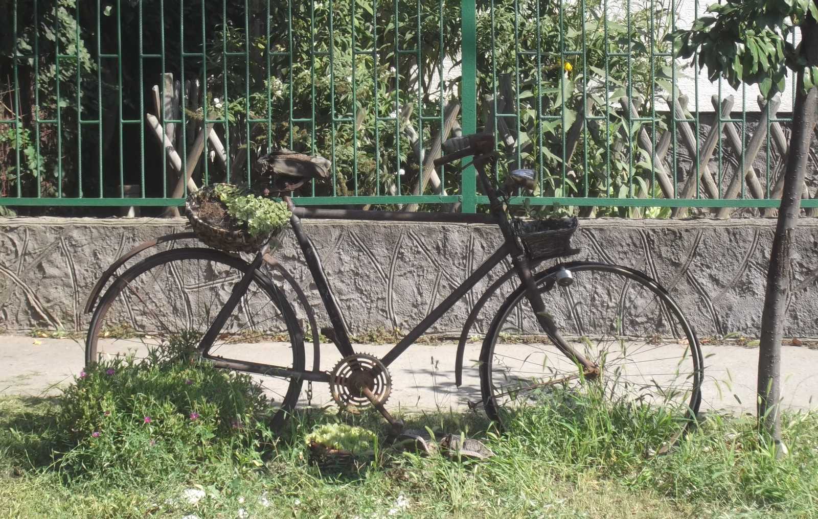 támasztott kerékpár, hanem ez kérem át lett alakítva virágállvánnyá!
