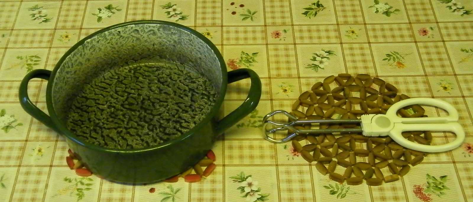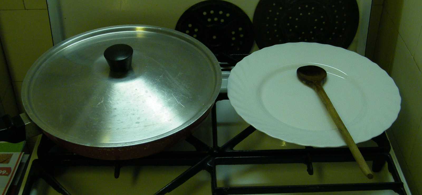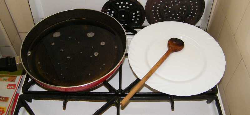 Miközben a máj a tűzhelyen rotyog, odakészítek az asztalra egy lábast, valamint azt az igencsak ötletes szerszámot is, amivel nyugodtan belenyúlhatok a forró zsírba. Mind a lábos, mind a kisvártatva mellékerülő serpenyő alá oda kell tenni valamit, amitől ezek ketten majd nem olvasztják el maguk alatt a terítőt. |