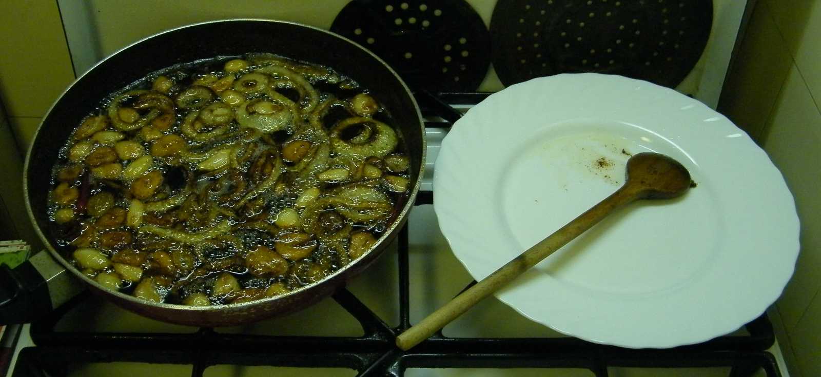 A hagymát és a fokhagymát én addig szoktam tovább sütni (ekkor persze már fedő nélkül), míg csak el nem párolog alóluk a víz (ezt onnan tudni, hogy akkor átlátszóvá kezd változni a zsír), majd hagyom még őket egy kicsit karamellizálódni. Ez utóbbi ízlés kérdése. Van aki ropogósan szereti a fokhagymát, van aki puhán, és olyan is akad, akinek akkor ízlik, mikor épp ragadóssá vált. Szerintem mindhárom állapotában finom, így ezt az ételt nem igazán tudom elrontani. |