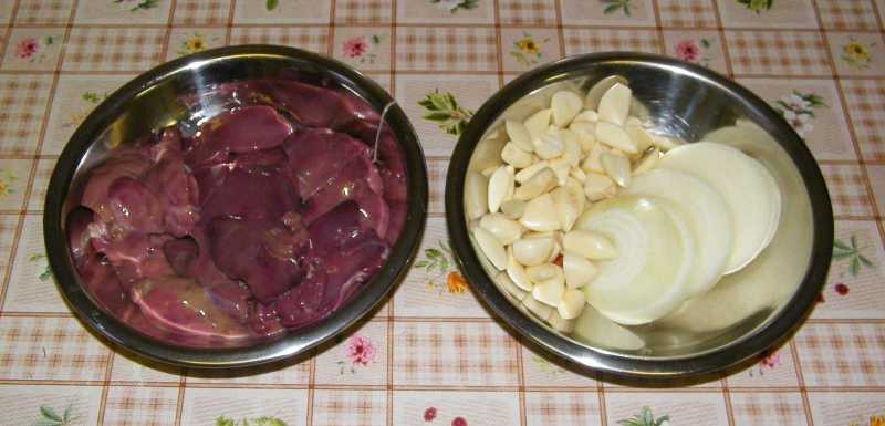 Mármint a szintén fél kiló csirkemáj, a vastagra karikázott nagy fej hagyma, valamint a három fej fokhagyma. Utóbbi ugyan soknak tűnik, de meglepő módon nem az! Nekem legalábbis - a késztermék evése közben - még sosem támadt olyan érzésem, hogy sok lenne benne a fokhagyma. |