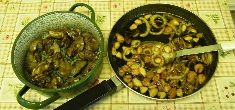 Mivel saját magától is szépen rotyog, én csak egyszer szoktam belenézni, úgy valahol félúton, nehogy még valamelyik máj kiragyogjon a többi közül. Mármint úgy kell lenniük a serpenyőben, hogy mindet ellepje a zsír, amiből többek közt ezért is kell fél kiló. |