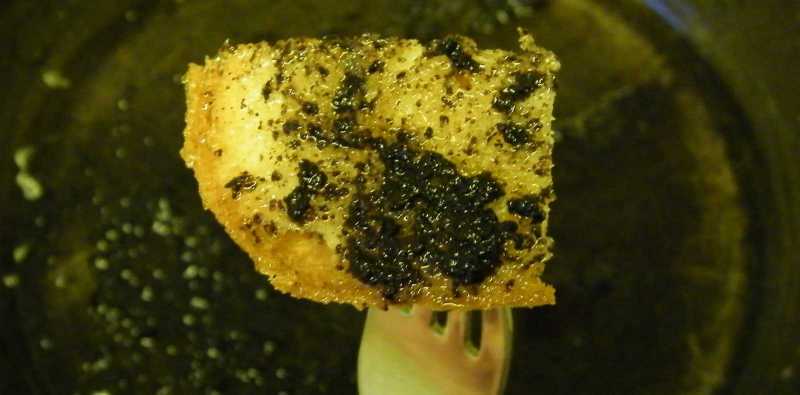 Ez persze nem akadályoz meg benne, hogy ami a serpenyőben maradt, azt némi kenyérdarabkákkal kitörölgessem. Bár úgy néz ki, mintha valami égett izé lenne a kenyéren, de azok igazándiból a májakról lehullott szemcsék. Amennyiben sikerült őket nem szénné égetni, akkor ez - mint bármelyik sült után a tepsi alja - valami elképesztően finom! |