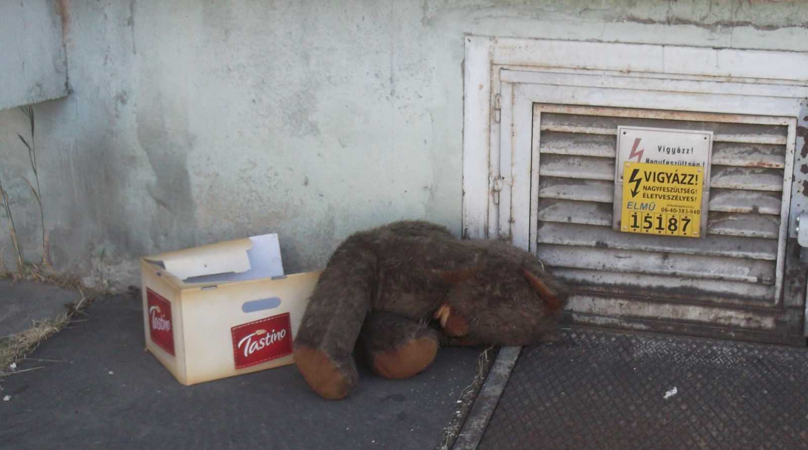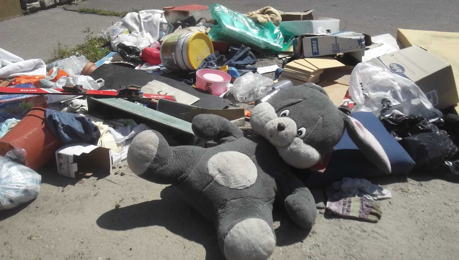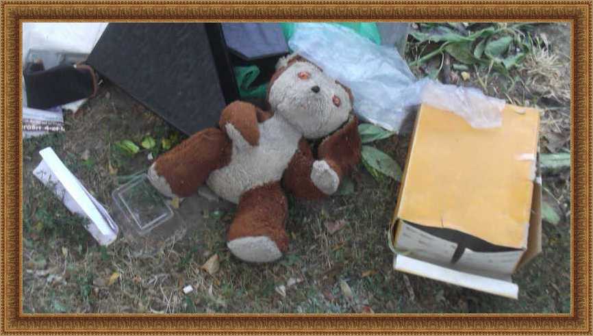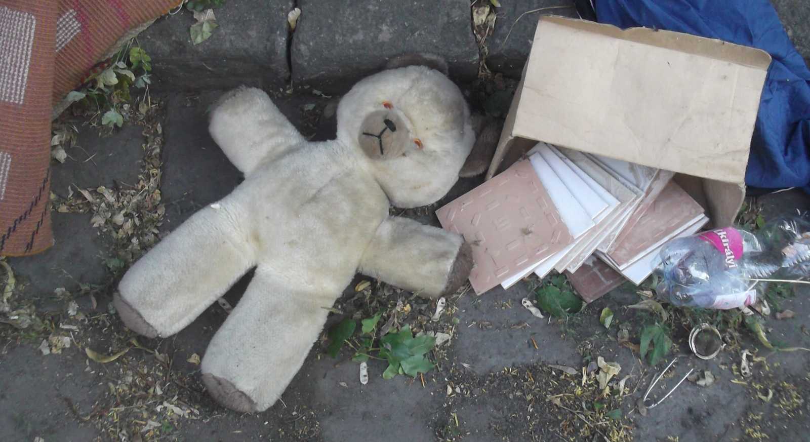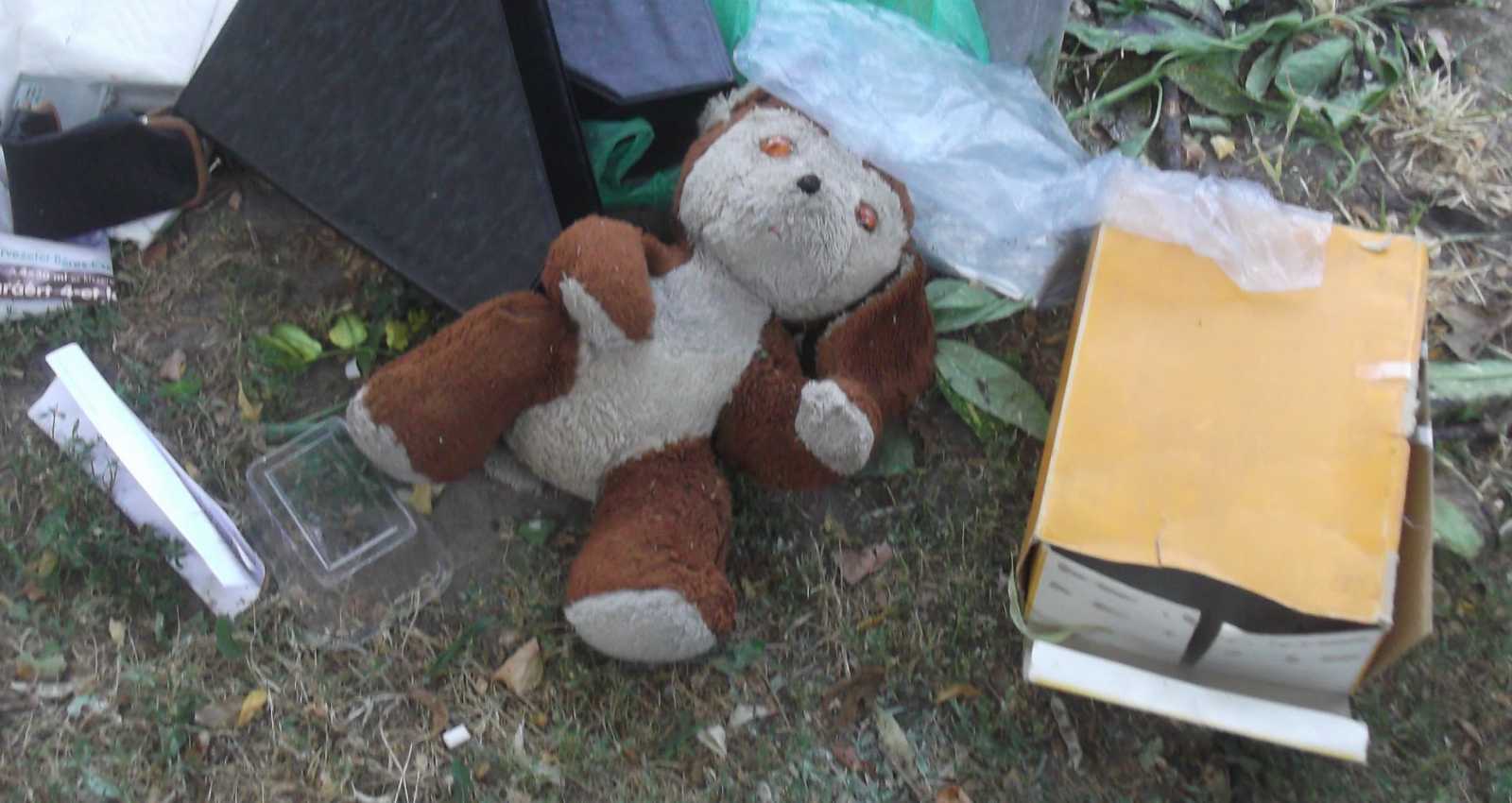 Felsorolom inkább nyitásképp a kidobva látott játékokat és plüssállatokat. Ez a maci a házunk előtti kupacon feküdt. Kezdetben mondjuk nem így, hanem csak úgy egyszerűen kidobva, de aztán jöttek a vasazók, és a velük együtt érkezett család apróbb tagjai szépen lefektették a macit. Mondhatni kedvesebben bántak vele, mint a gazdája aki kidobta. |