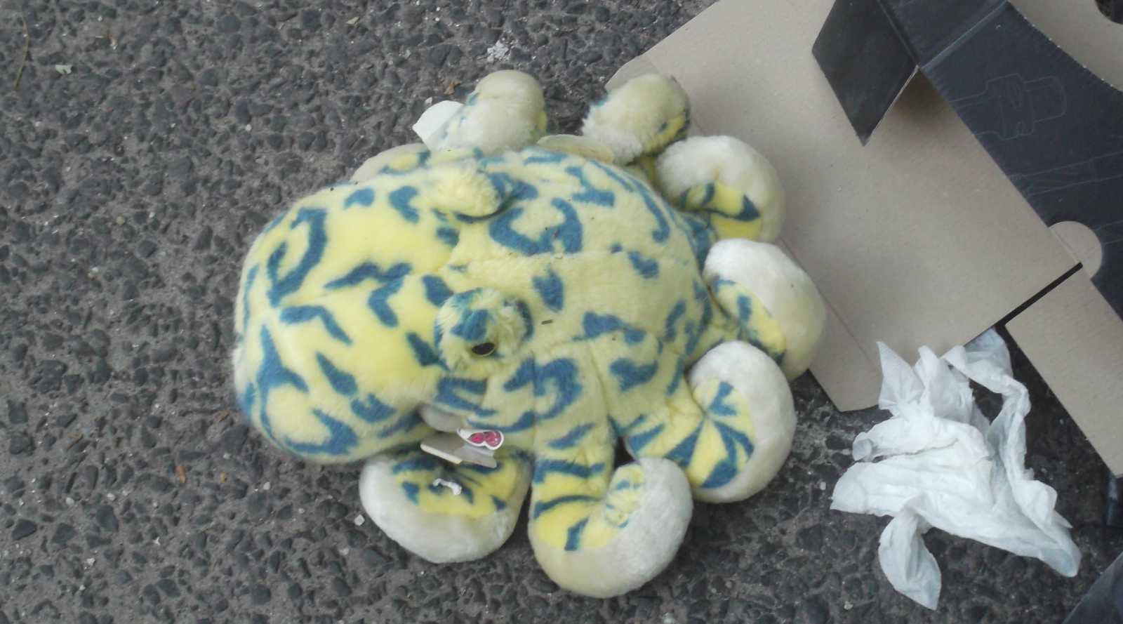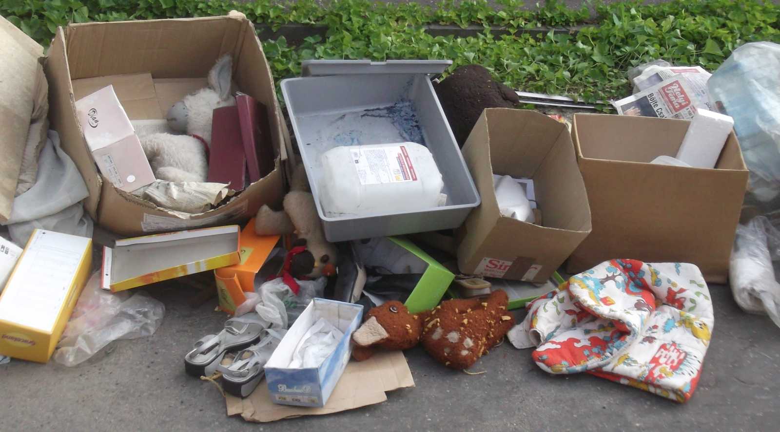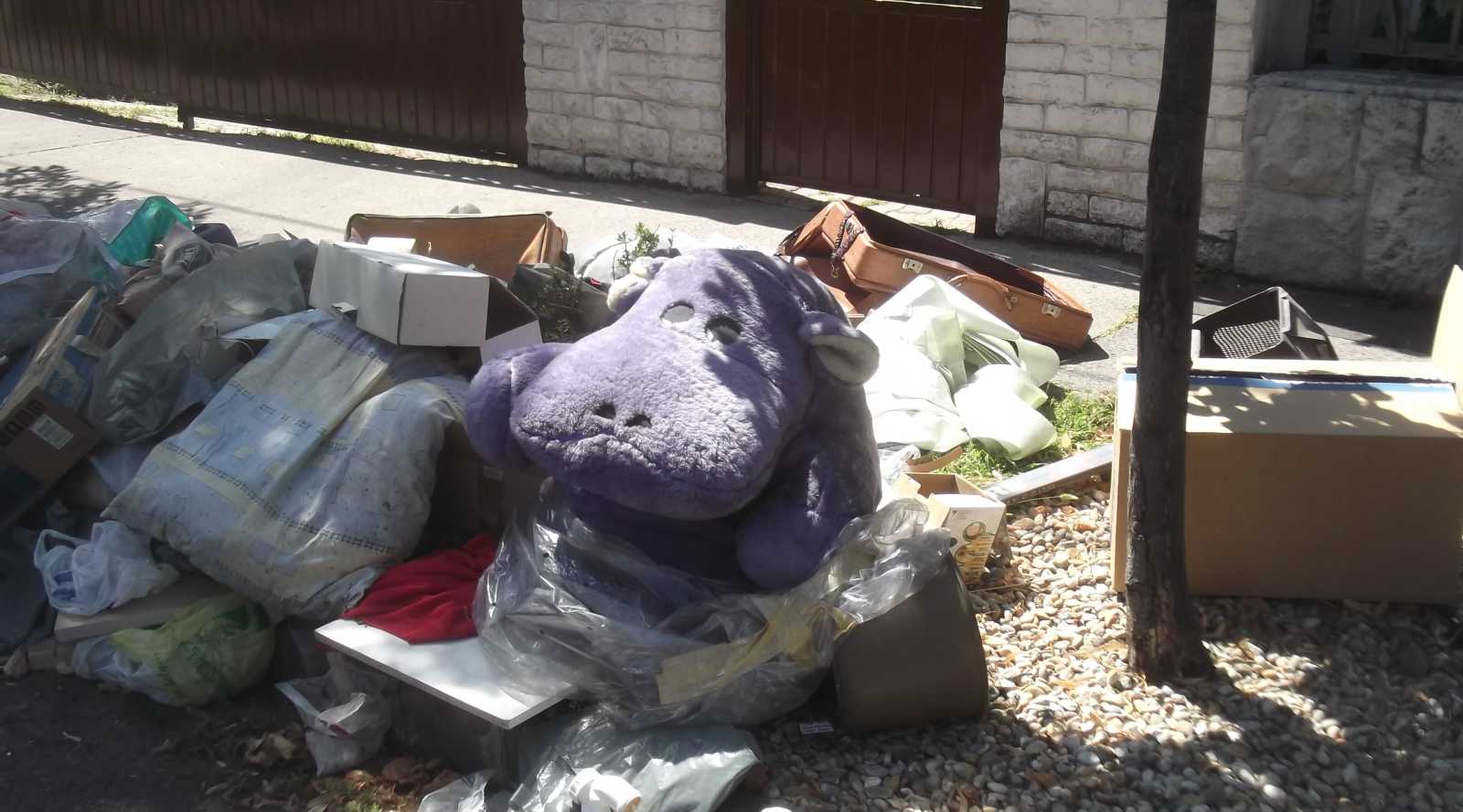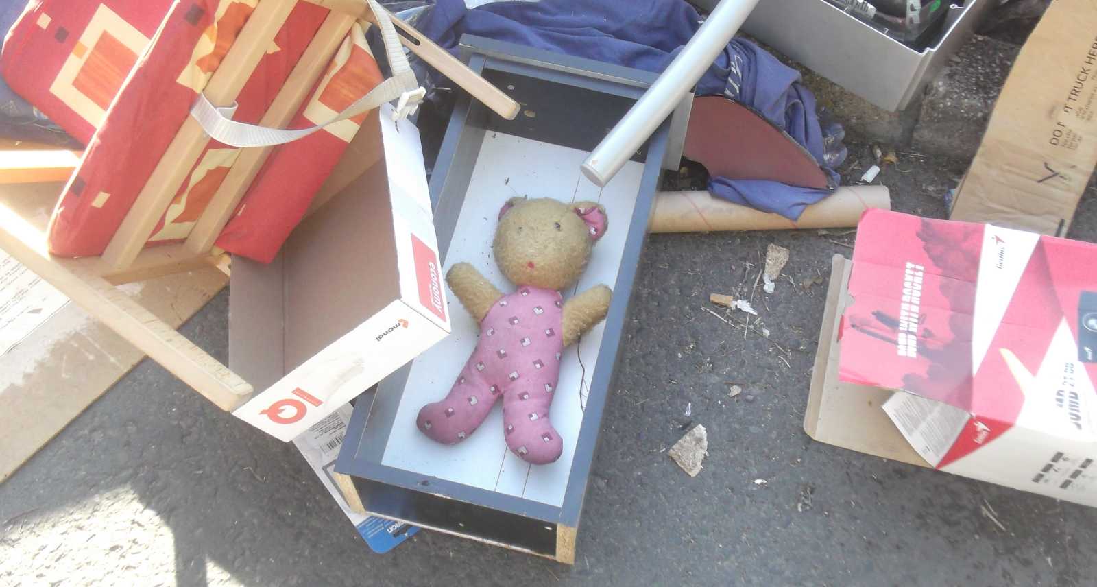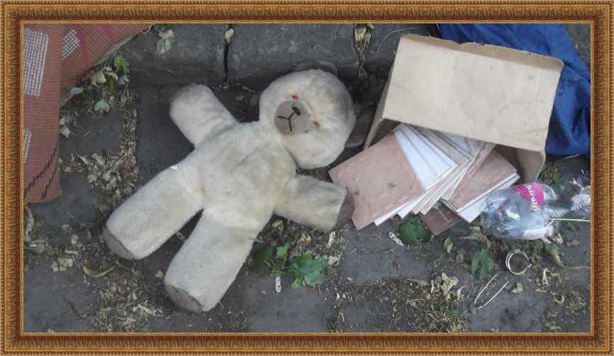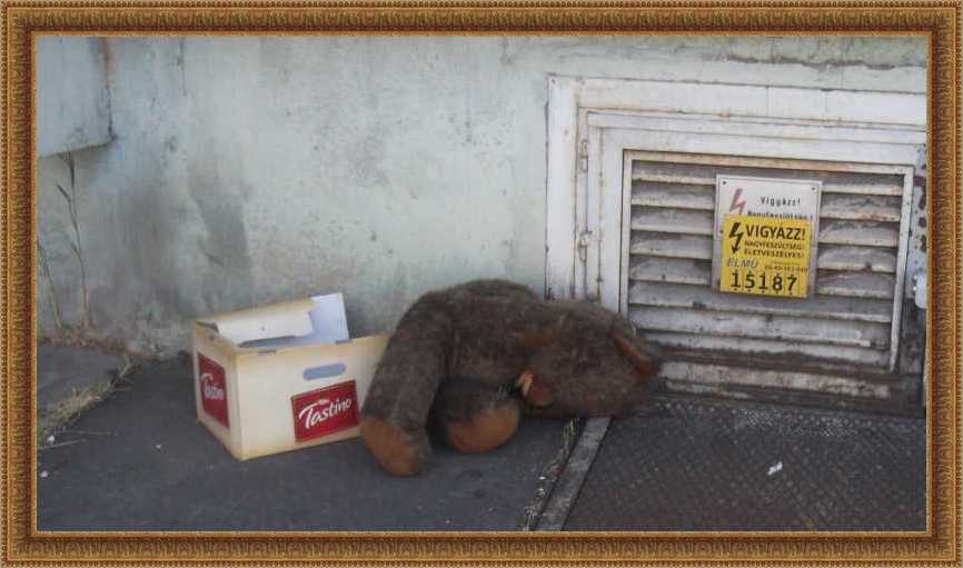 Felsorolom inkább nyitásképp a kidobva látott játékokat és plüssállatokat. Ez a maci a házunk előtti kupacon feküdt. Kezdetben mondjuk nem így, hanem csak úgy egyszerűen kidobva, de aztán jöttek a vasazók, és a velük együtt érkezett család apróbb tagjai szépen lefektették a macit. Mondhatni kedvesebben bántak vele, mint a gazdája aki kidobta. |