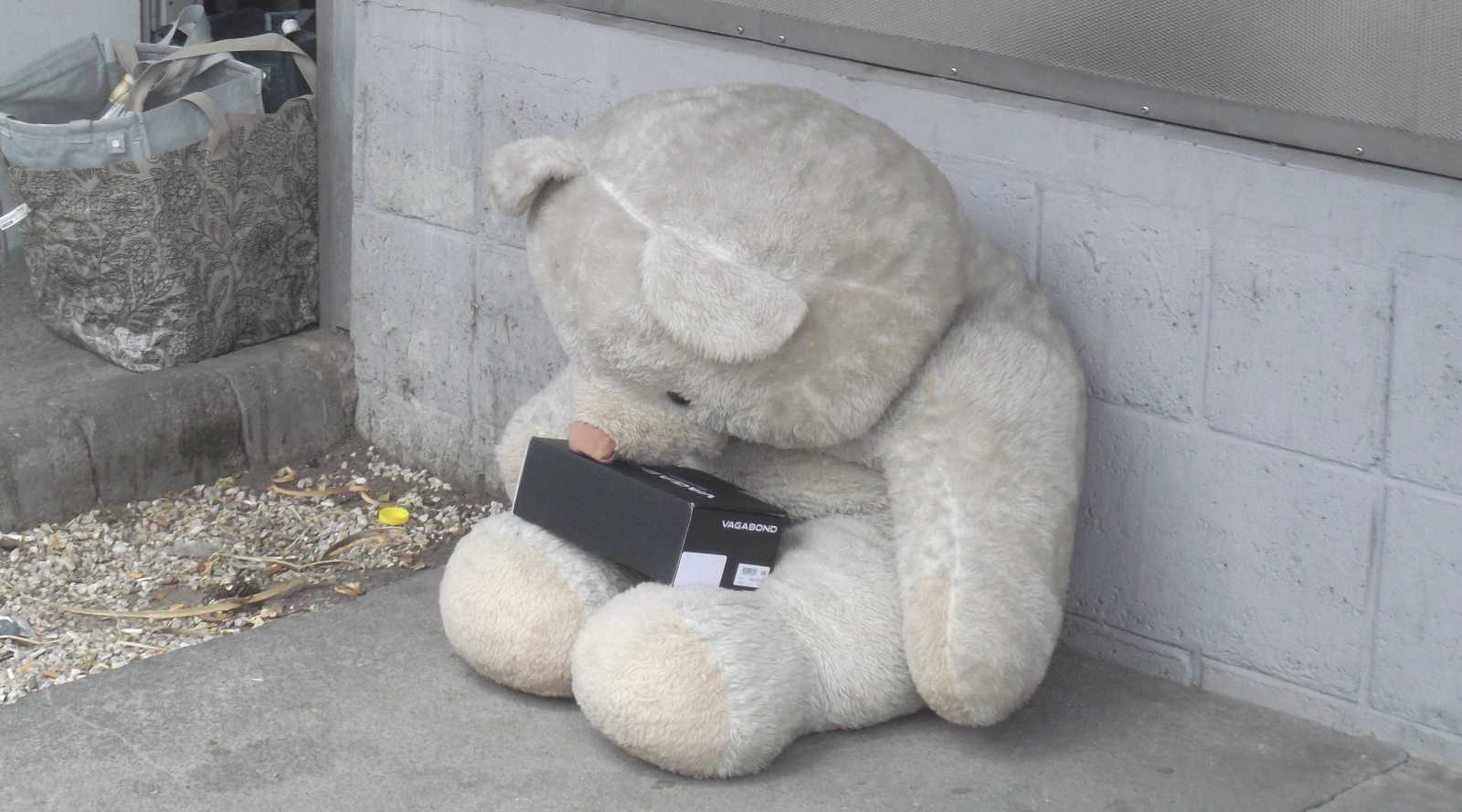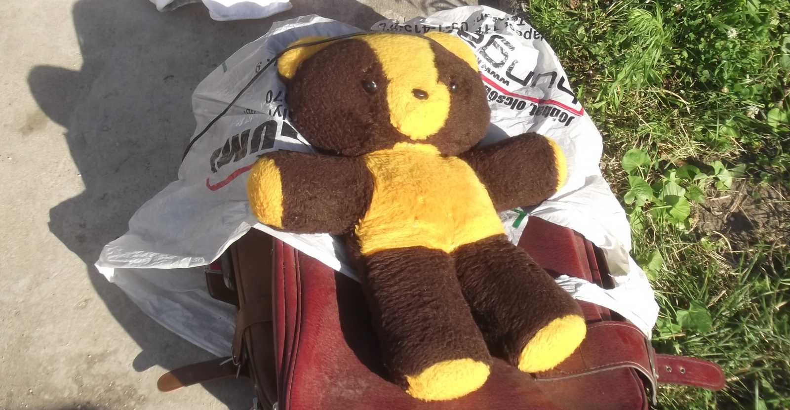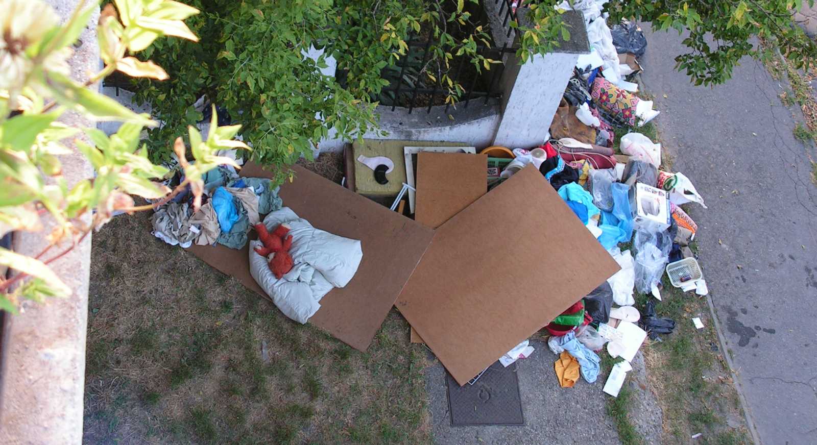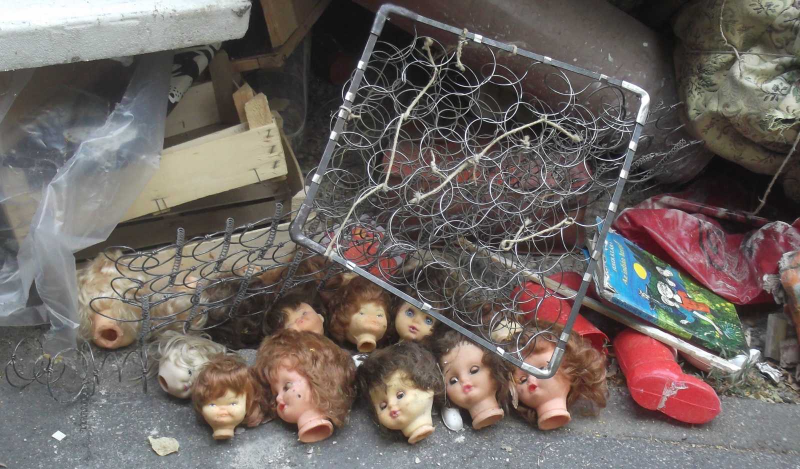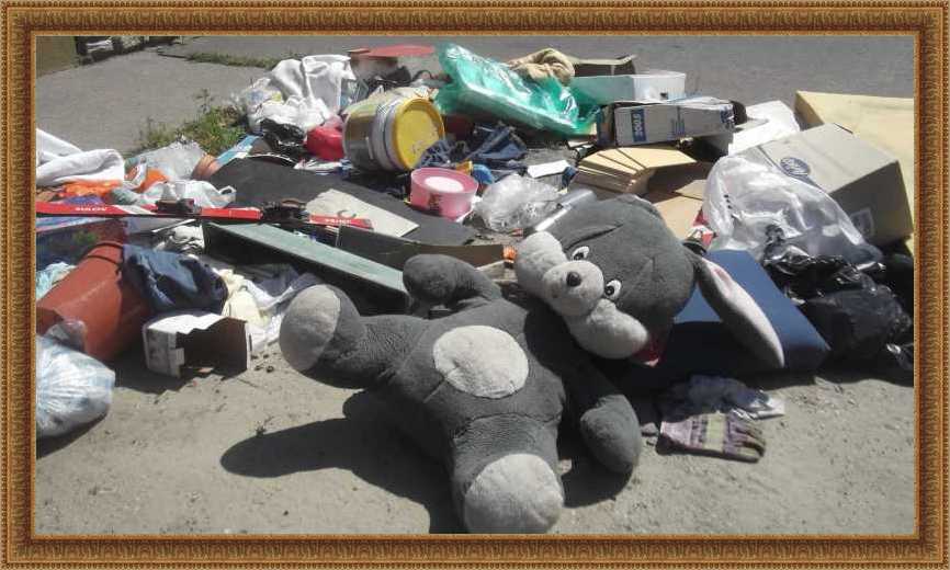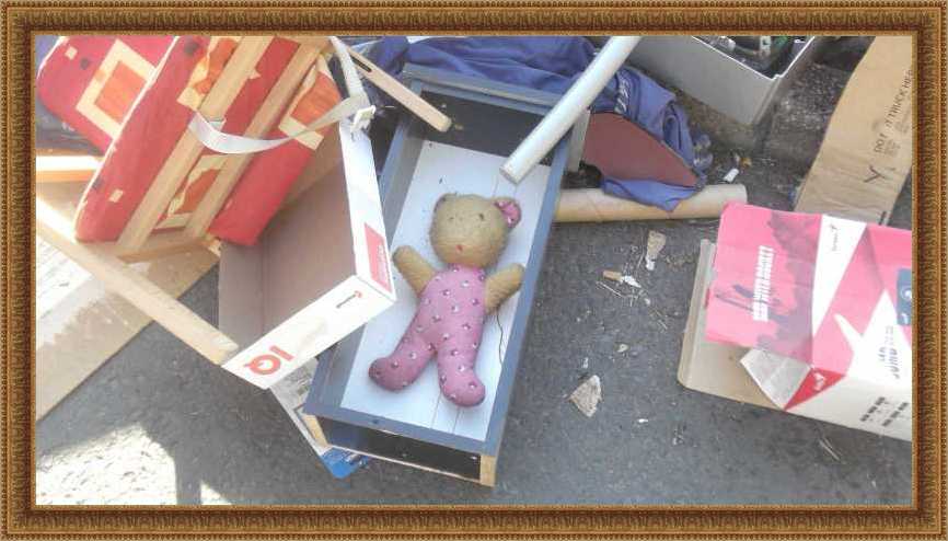 Felsorolom inkább nyitásképp a kidobva látott játékokat és plüssállatokat. Ez a maci a házunk előtti kupacon feküdt. Kezdetben mondjuk nem így, hanem csak úgy egyszerűen kidobva, de aztán jöttek a vasazók, és a velük együtt érkezett család apróbb tagjai szépen lefektették a macit. Mondhatni kedvesebben bántak vele, mint a gazdája aki kidobta. |