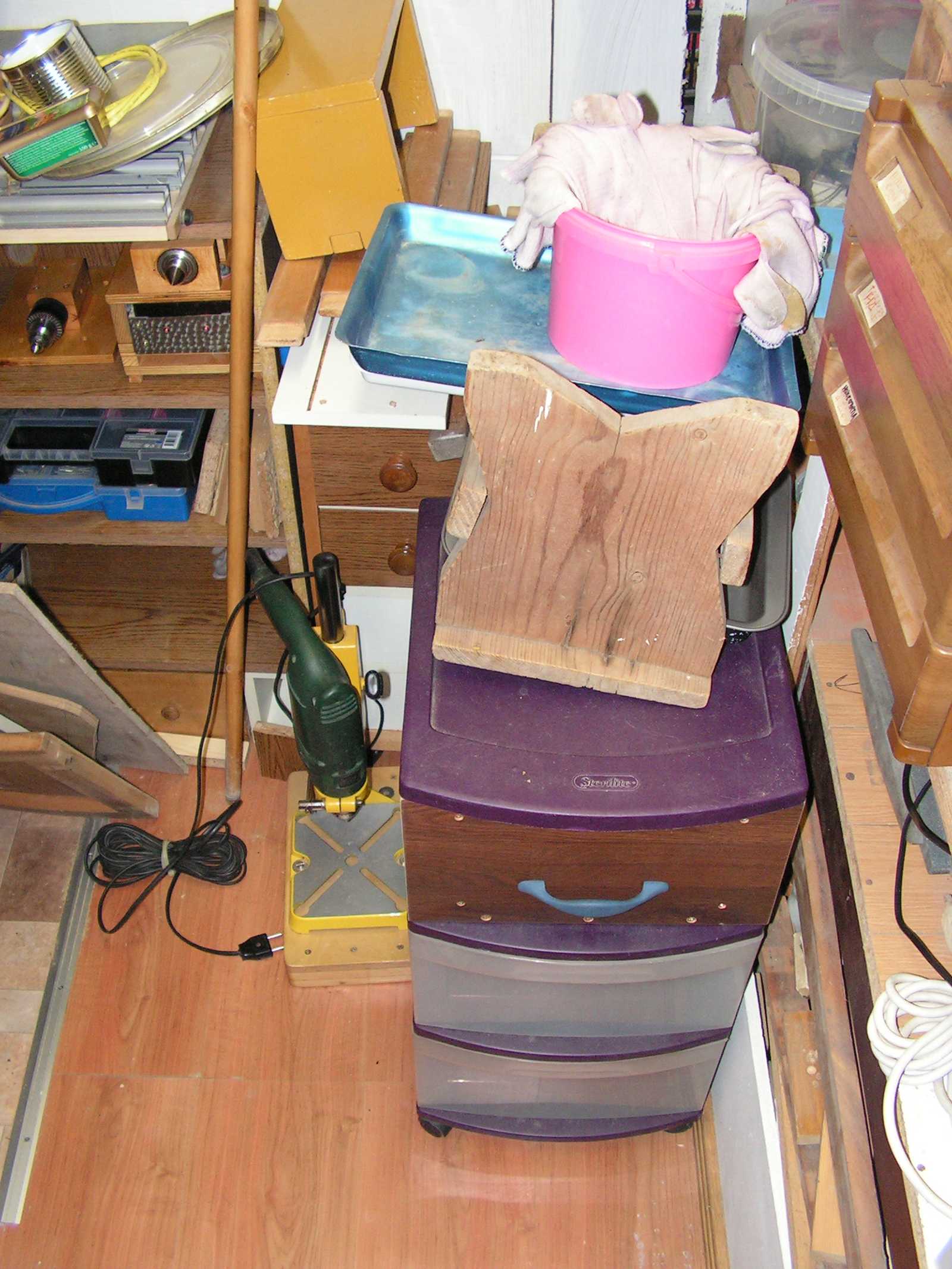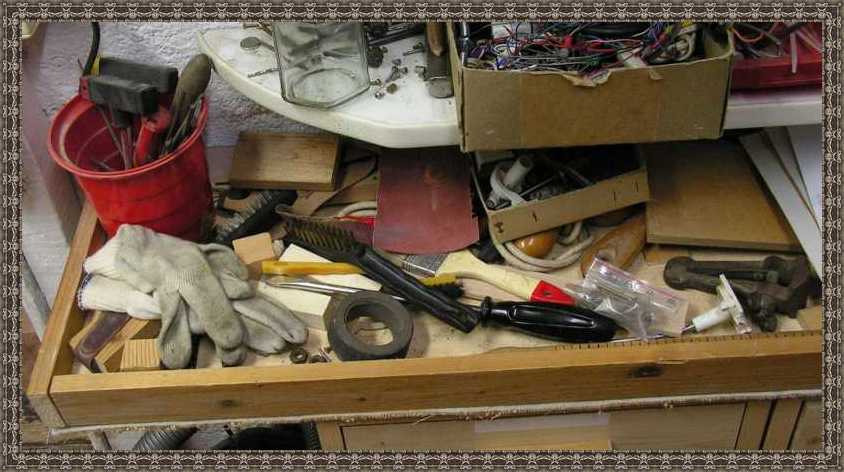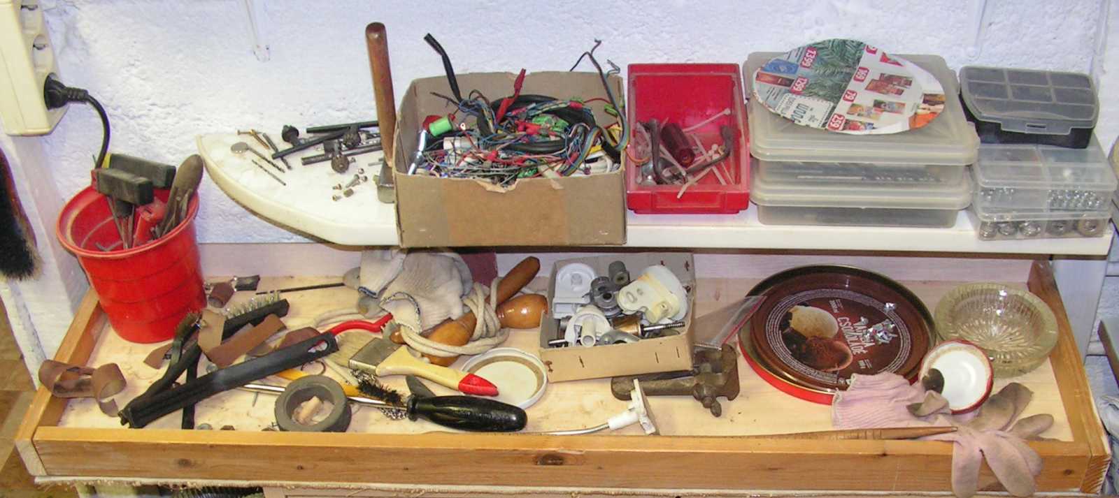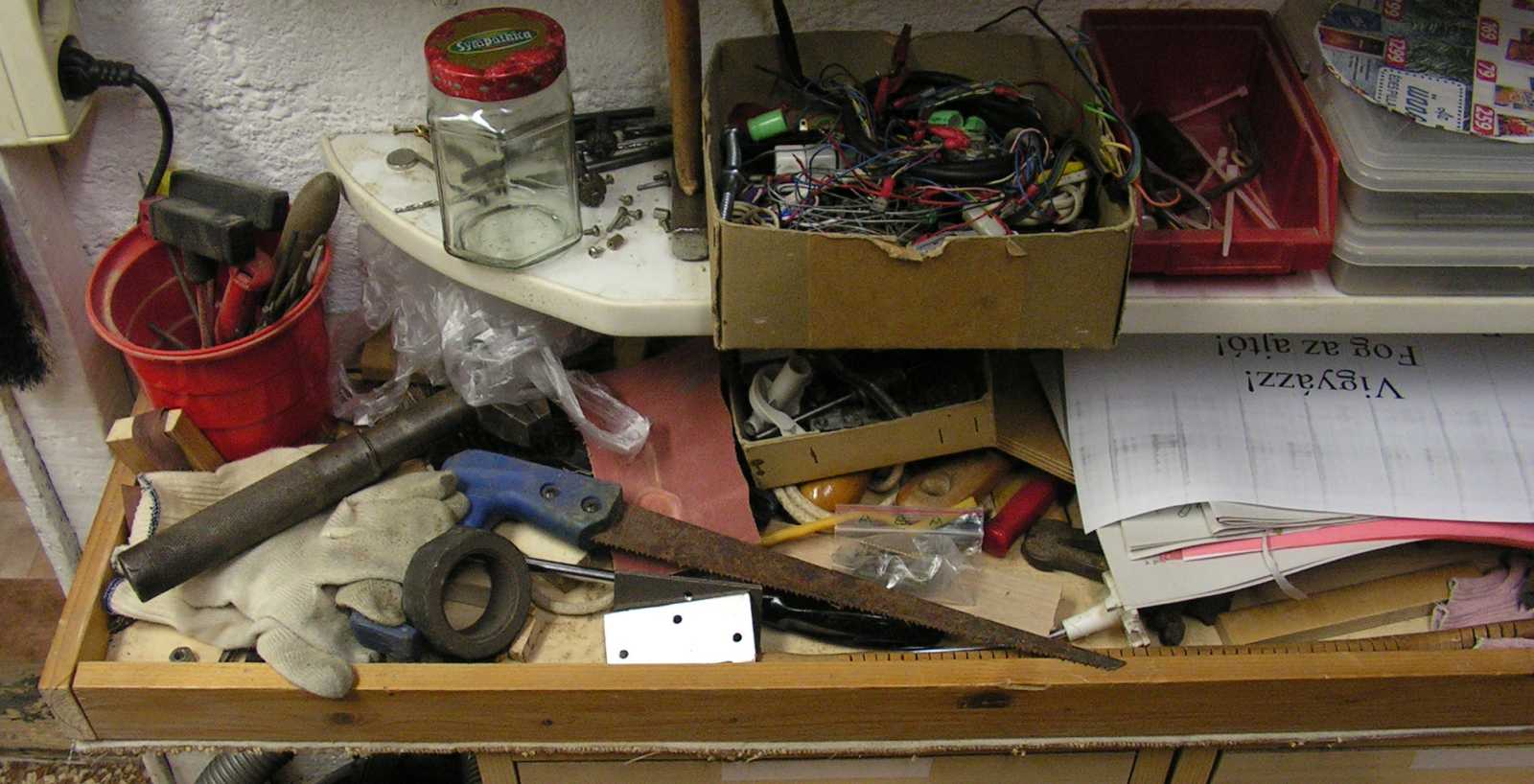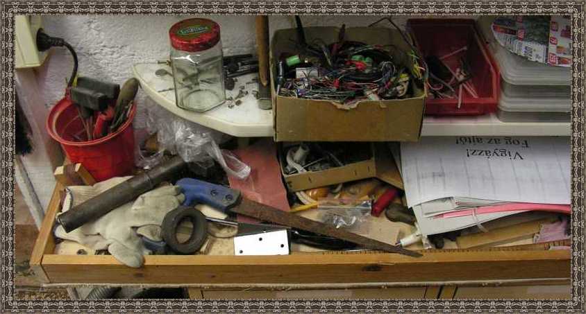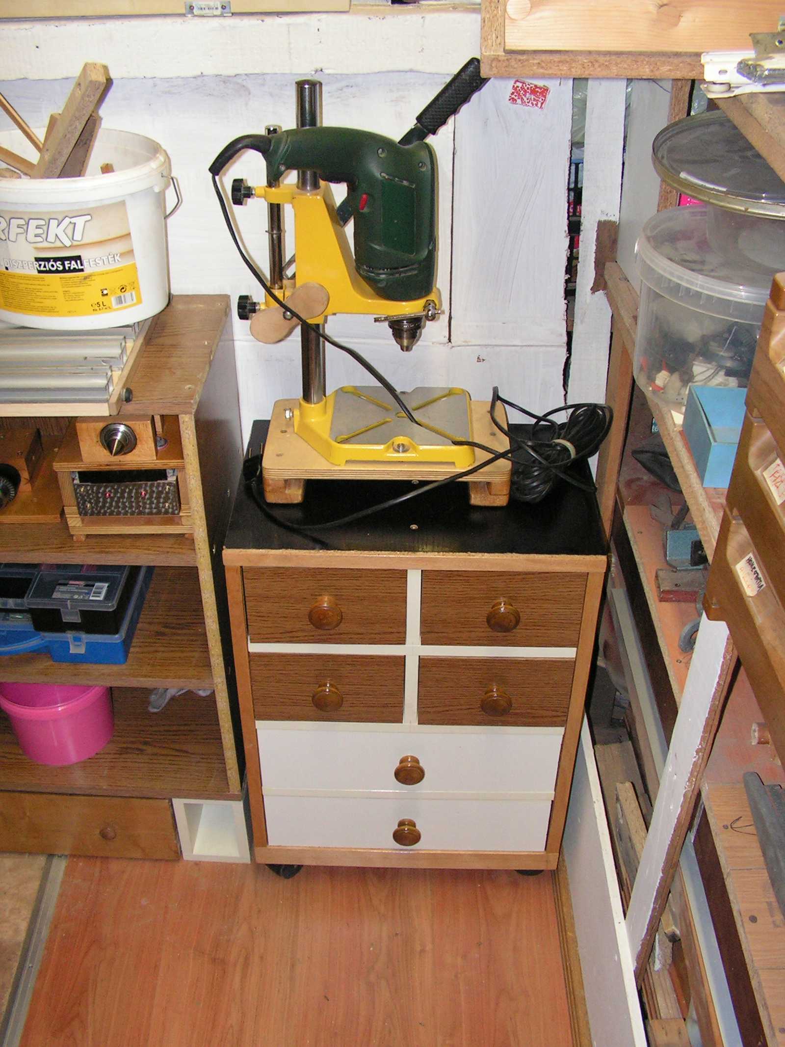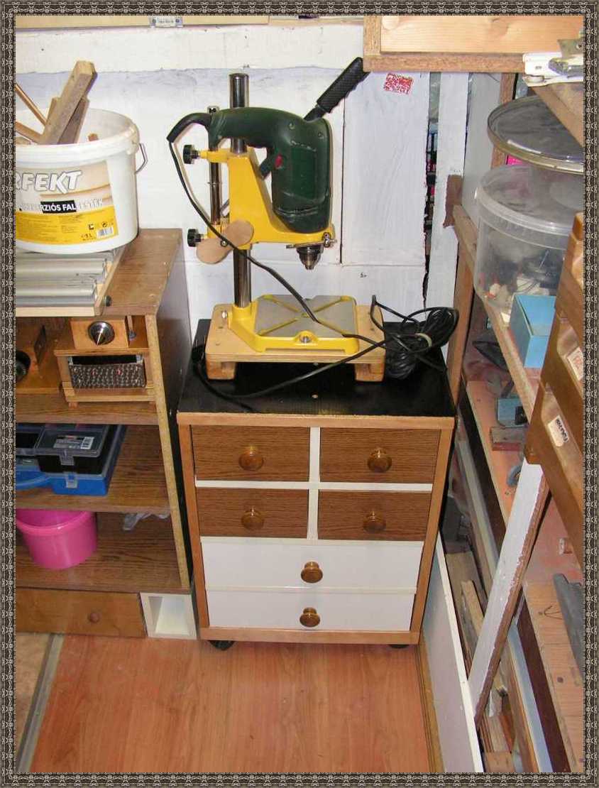 Erre a kupira viszont igenis emlékeszem, hiszen egészen eddig erről beszéltem. Az állványra szerelt fúrógép mögötti fiókos szekrényke teteje úgy lett méretezve, illetve azon célból lett szabadon hagyva (hát ja...), hogy majd azon lesz a fúrógép. Mármint ezentúl örökre, hogy a még csak le sem kell érte hajolni pozíciója okán mindig könnyű legyen elővenni. Ehhez, mármint az amúgy nagyszerű tervhez képest nagyon másképp áll a helyzet. Persze ha csak annyi lenne a rumli, mint amennyit ezen a képen látunk, akkor meg sem említettem volna, hiszen ez még csak nem is súrolja az igencsak magas ingerküszöbömet! |