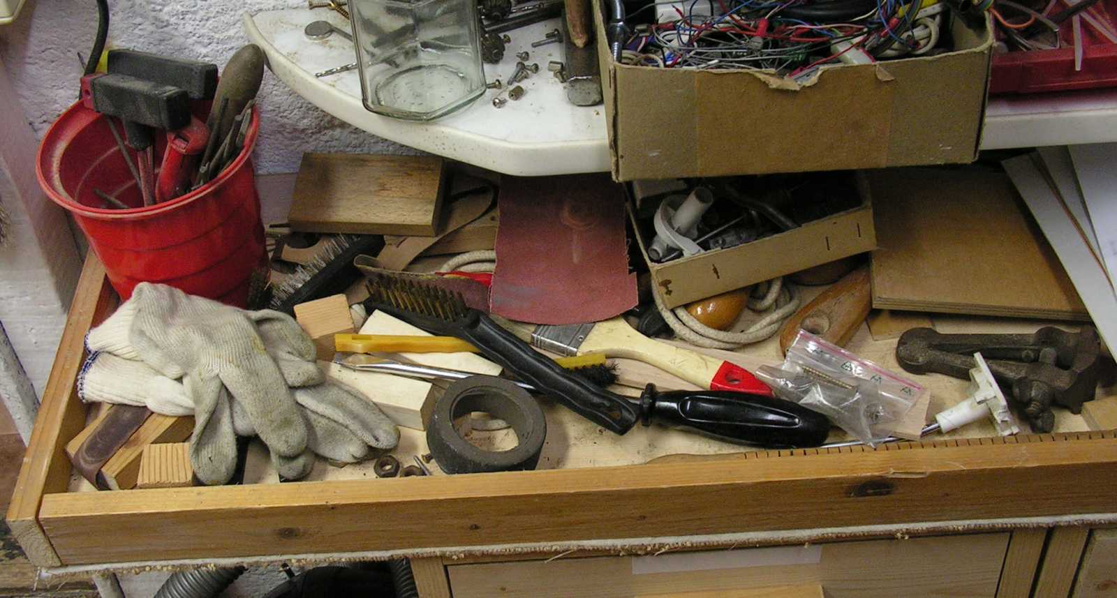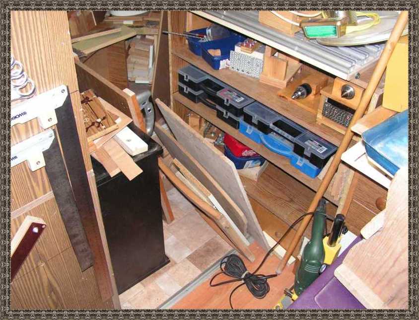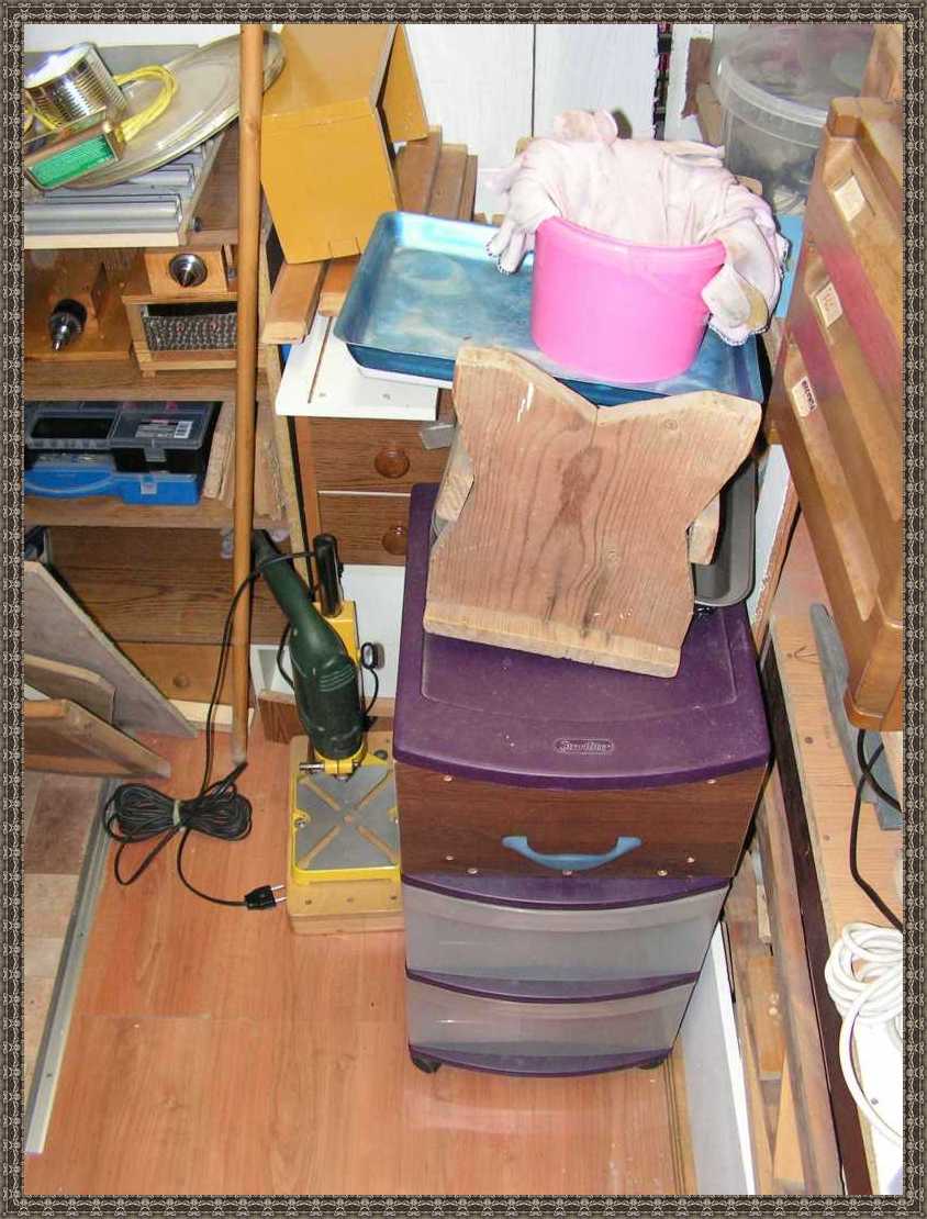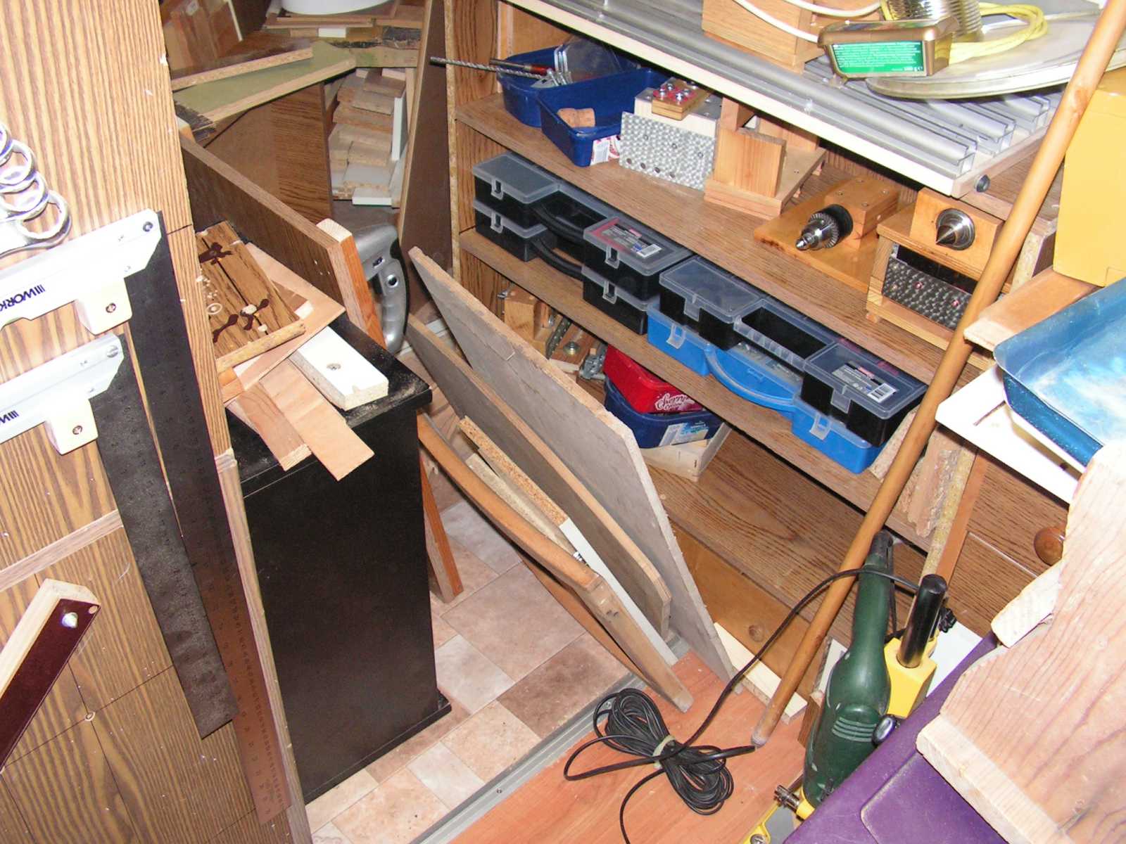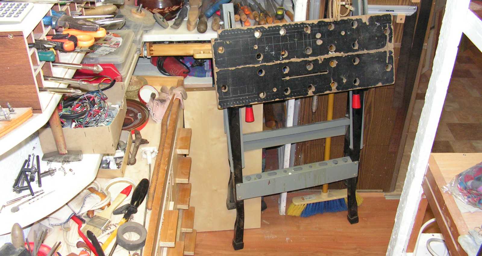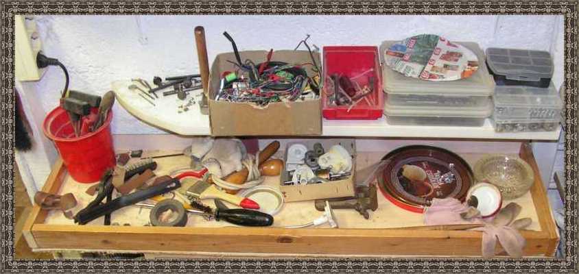 Erre a kupira viszont igenis emlékeszem, hiszen egészen eddig erről beszéltem. Az állványra szerelt fúrógép mögötti fiókos szekrényke teteje úgy lett méretezve, illetve azon célból lett szabadon hagyva (hát ja...), hogy majd azon lesz a fúrógép. Mármint ezentúl örökre, hogy a még csak le sem kell érte hajolni pozíciója okán mindig könnyű legyen elővenni. Ehhez, mármint az amúgy nagyszerű tervhez képest nagyon másképp áll a helyzet. Persze ha csak annyi lenne a rumli, mint amennyit ezen a képen látunk, akkor meg sem említettem volna, hiszen ez még csak nem is súrolja az igencsak magas ingerküszöbömet! |