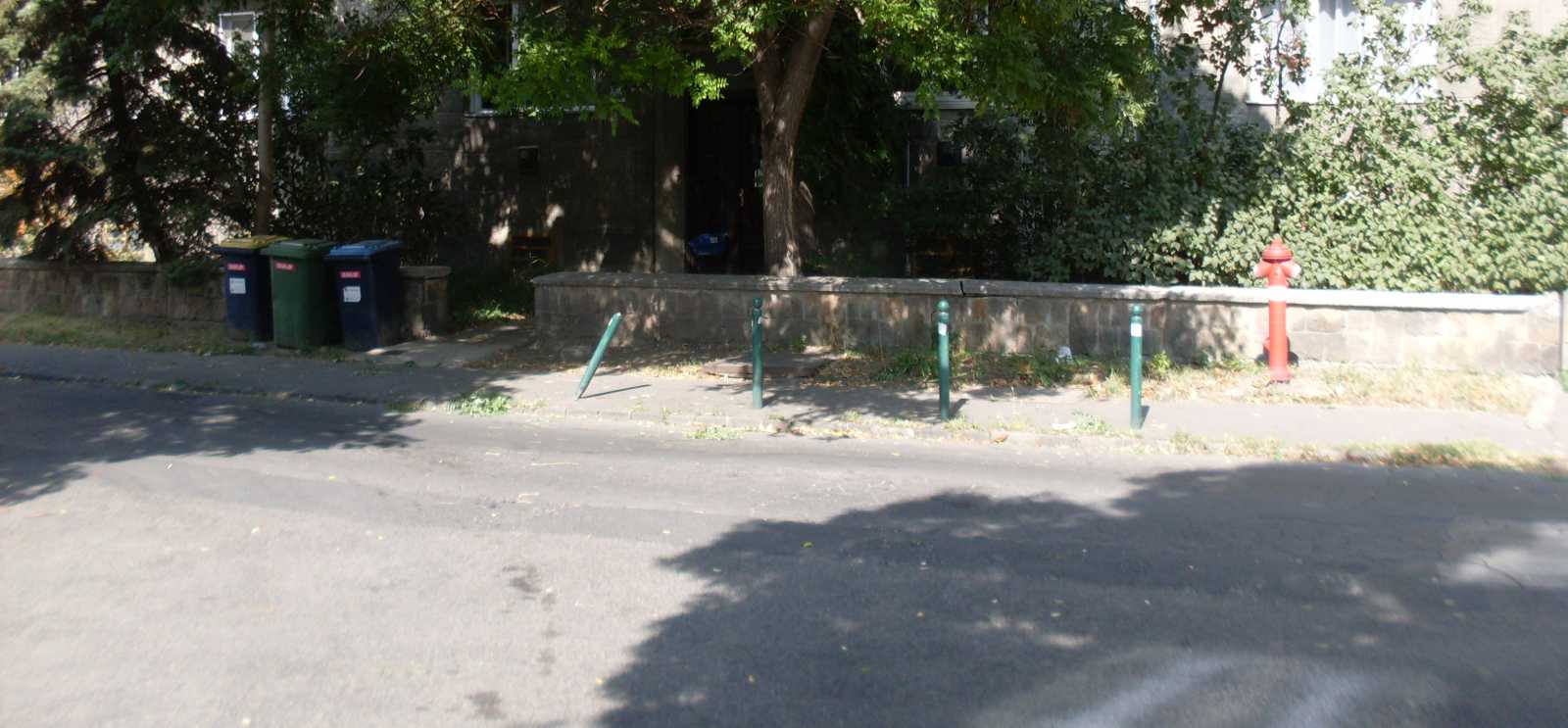 Mikor egy nagyobb jármű nem tud a kútról kikanyarodni, vagy beszorul, olyankor megrongálja a direkt a gyalogosok, no meg a járda fizikai állapota védelmére odatett oszlopokat, melyek közül amúgy balról már hiányzik egy. |