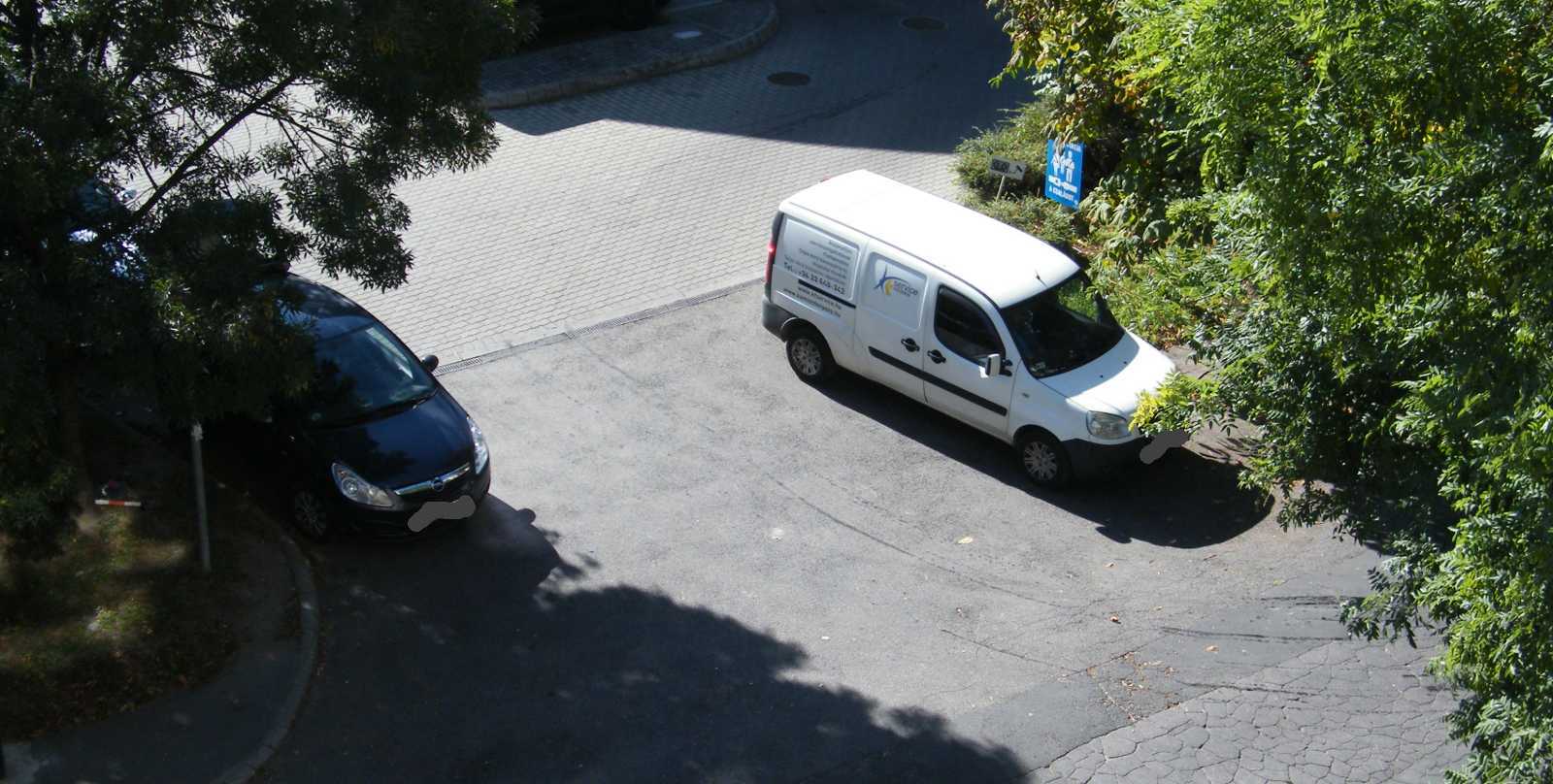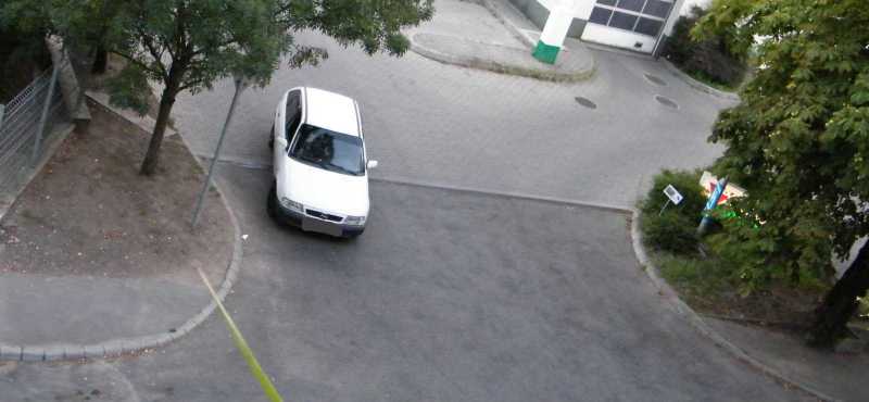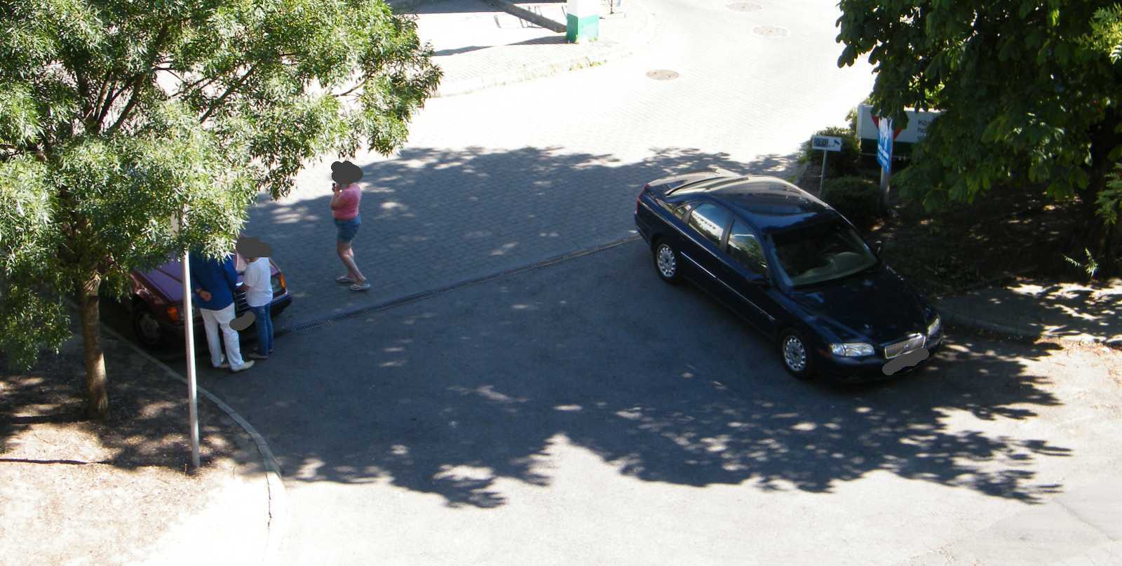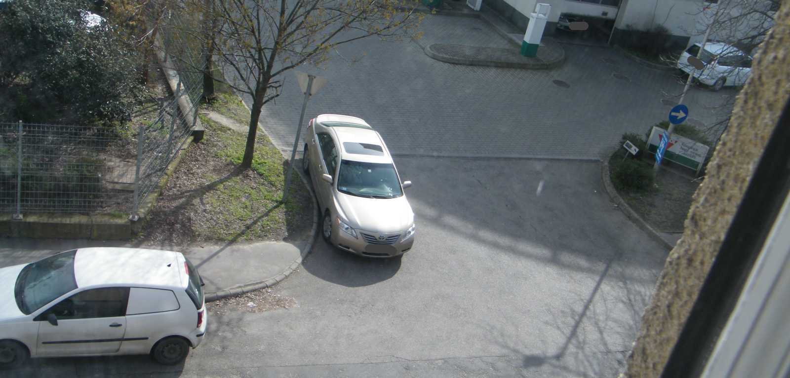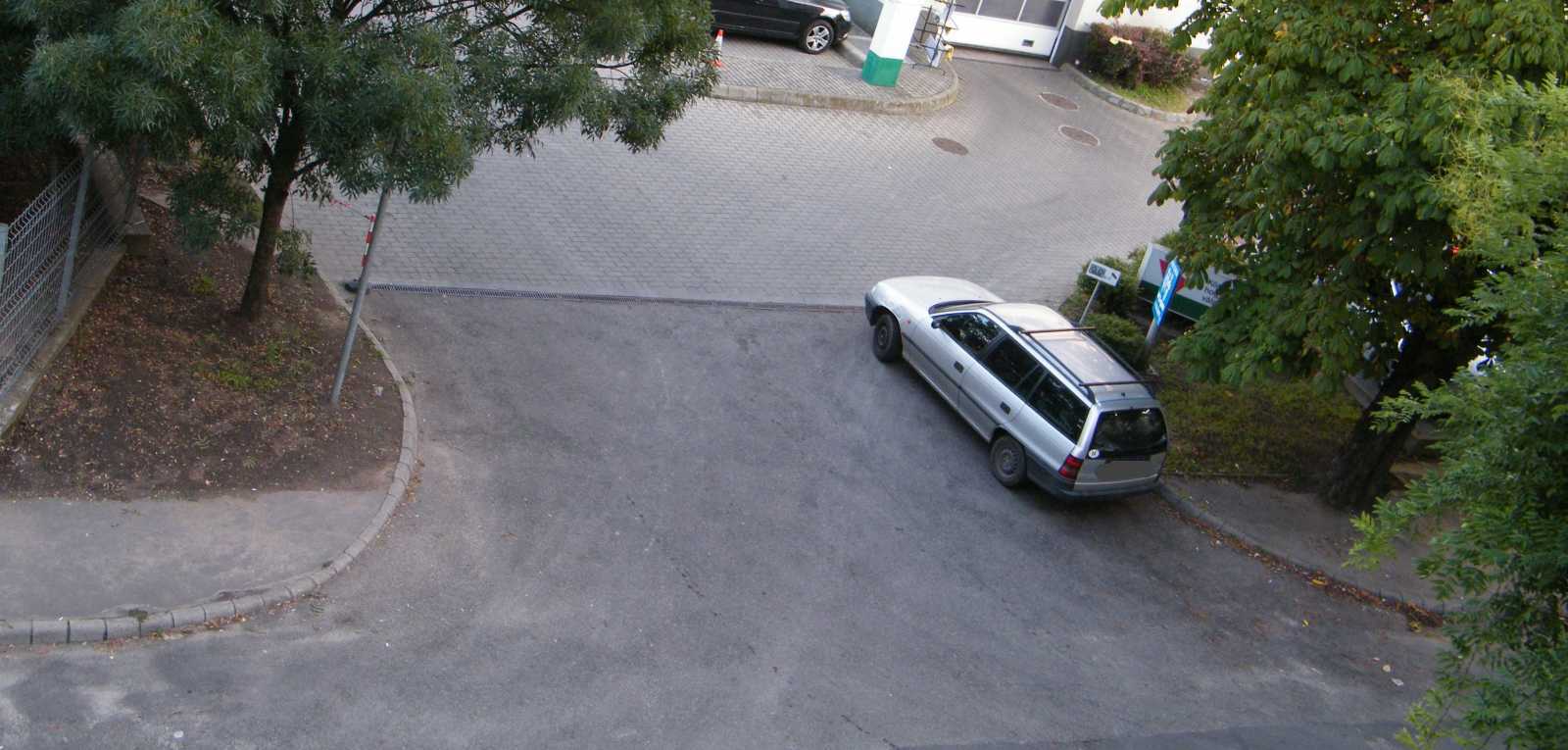 Az egyik autó a kapubejárót állja el, míg a másik az egyiket. Ezt a helyzetet azóta egyébként megszüntettük, mert egyrészt az udvar (a kocsi beállóval együtt) tűzoltósági felvonulási útvonal (vannak lakások, melyek csak a kertből olthatók), másrészt a képből kilógó kocsi pont a vízóra aknáján áll. Márpedig ha valami baj van (csőtörés), nálunk csak az aknában lehet elzárni a vizet. |