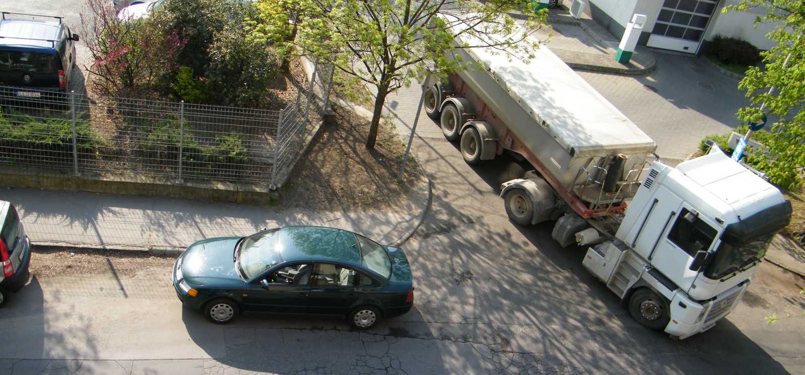 A kanyarban álló személyautóban hiába ül egy ember, mert az nem a sofőr, és persze nem is állt odébb, mire fel a teherautó vezetője hatalmas dudálást rendezett. A kép készítésének lehetőségére amúgy épp ez hívta fel a figyelmemet. Délutáni szendergés közben ilyenkor persze a pokolba kívánok minden szabálytalan autóst. |