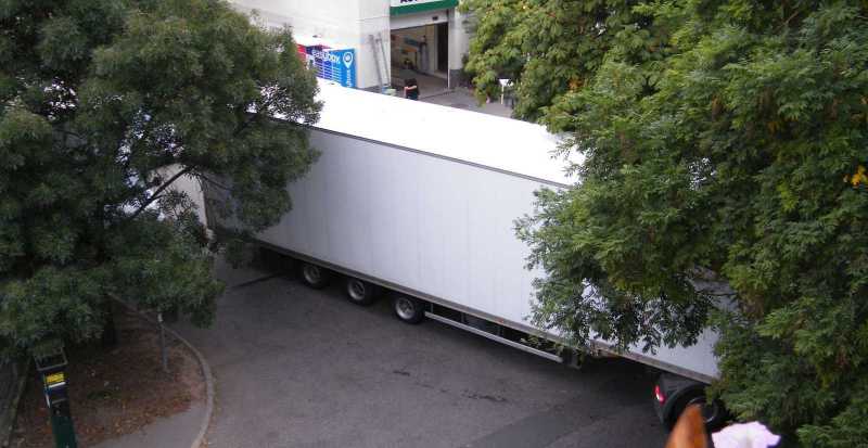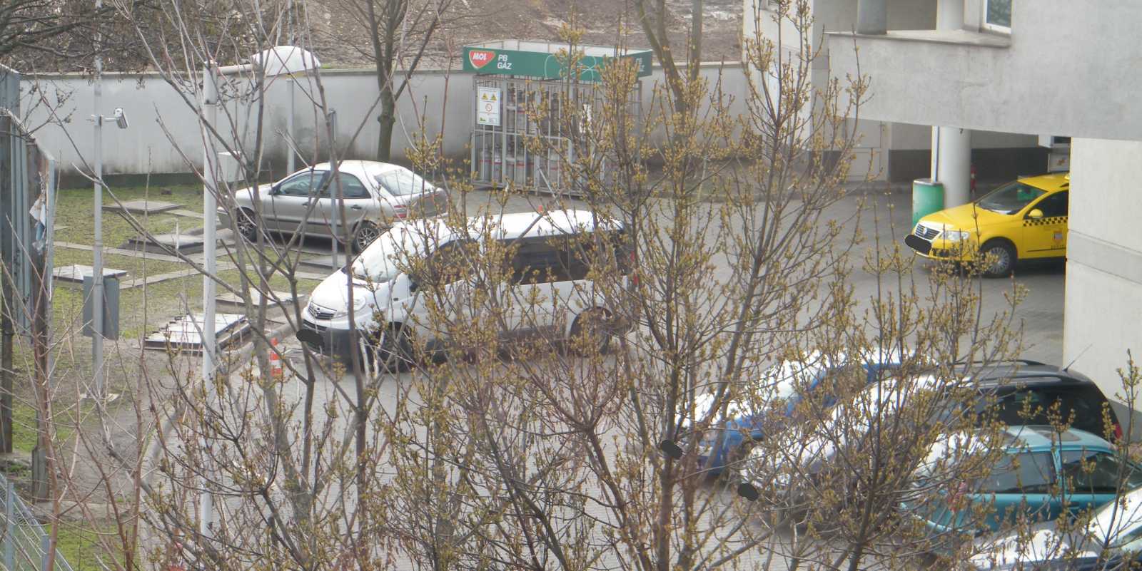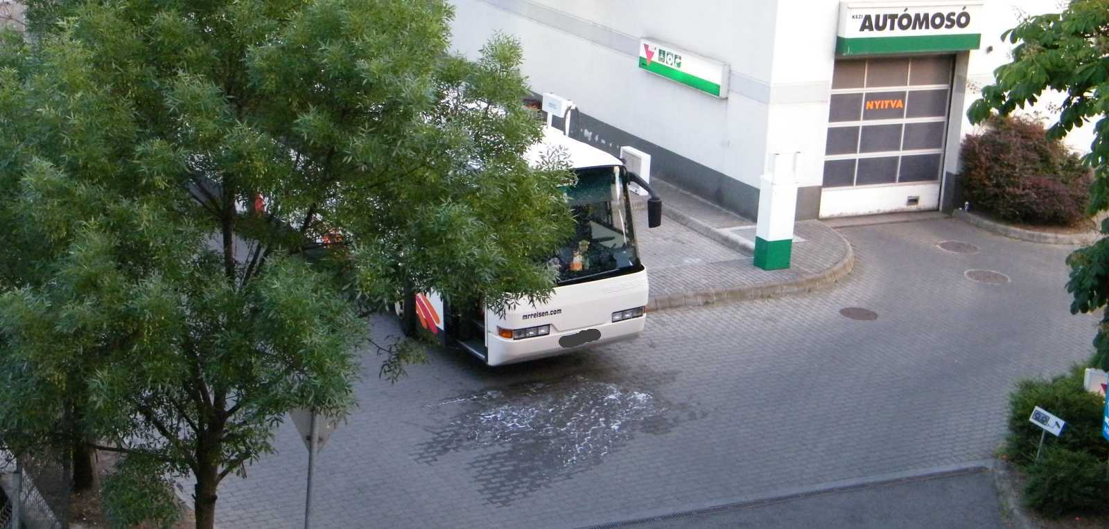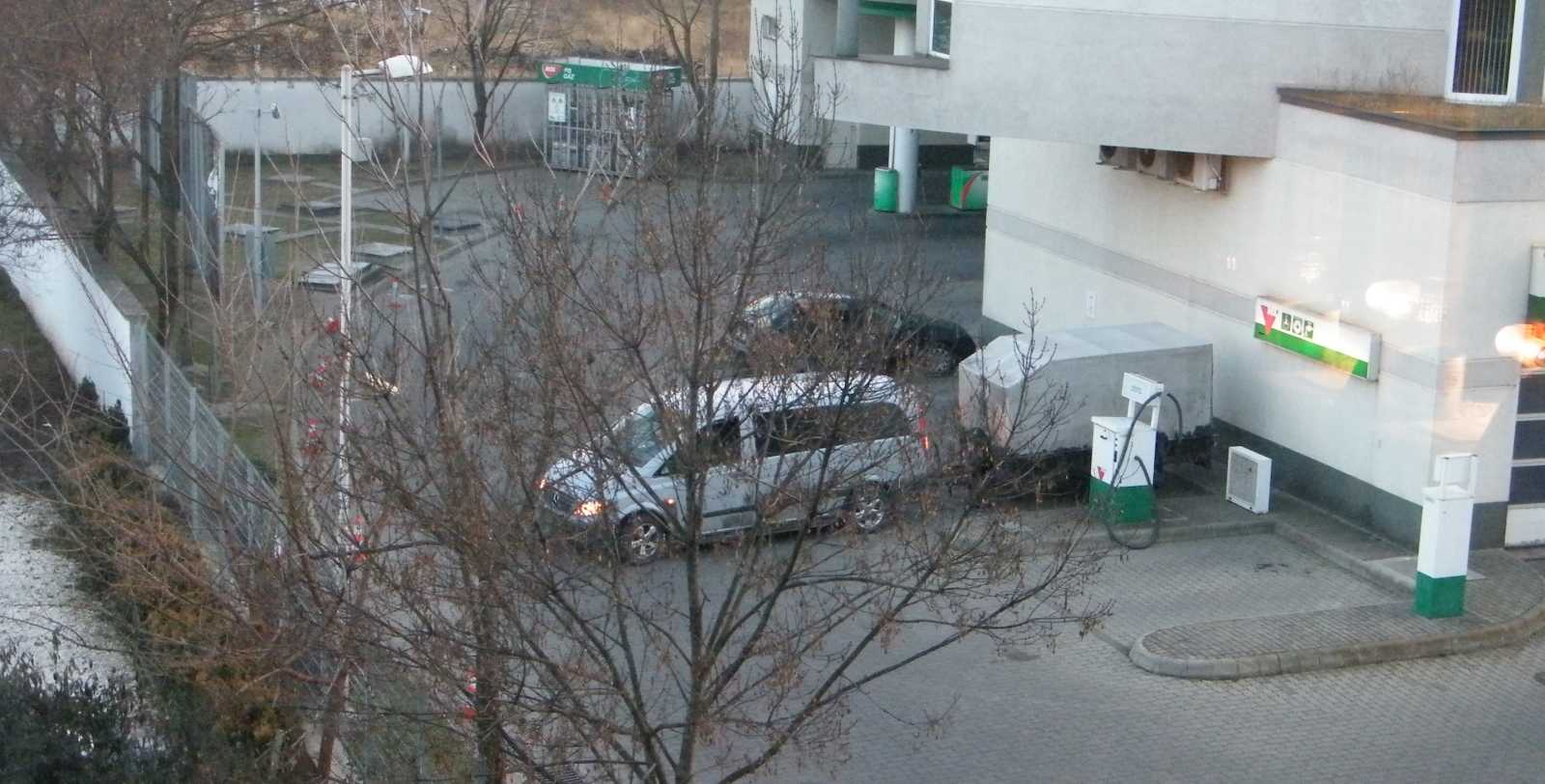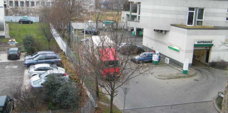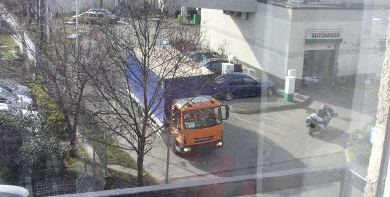 Egy ekkora benga kamionnal - ami ugyan miért ne tankolhatna itt - már akkor is nehéz a benzinkútról kifordulni, ha a benzinkút kijáratának közelében mindenki szabályosan parkol. Hogy szegény sofőr mit össze nem szerencsétlenkedett, az szó szerint lelombozó volt. |