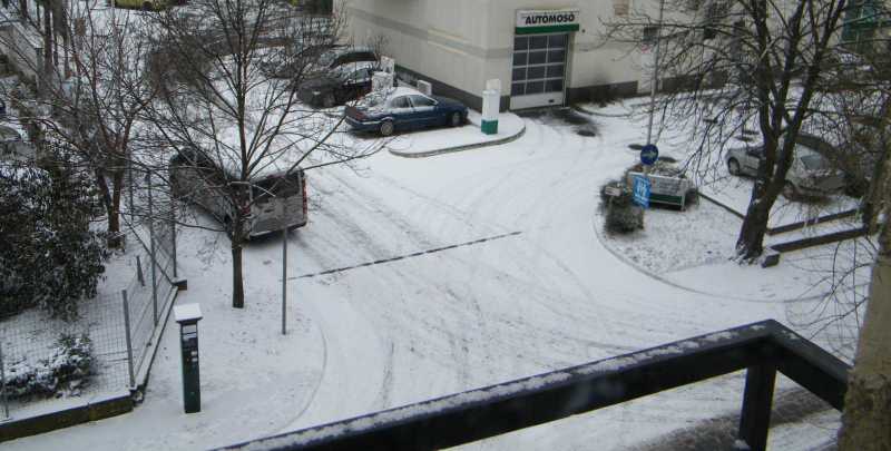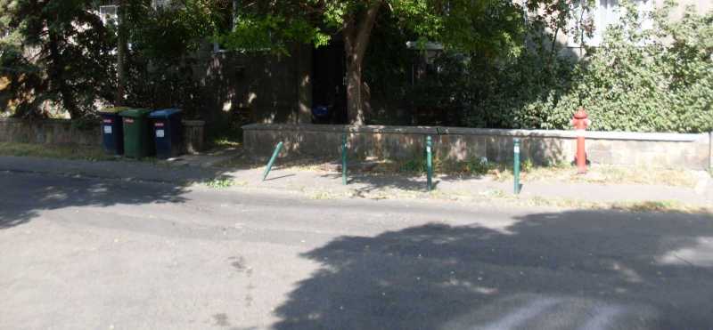 Ez most a házunk előtti járda, vagyis az előbb látott helyszínnel átellenes rész, ahol nemhogy egy, de mindjárt két autó is telibe parkolta a járdát. Aztán reggel meg van csodálkozás, mikor a kukások hagytak az autón némi nyomot. Mármint mert a zöld kuka nem fért ki a résen. |