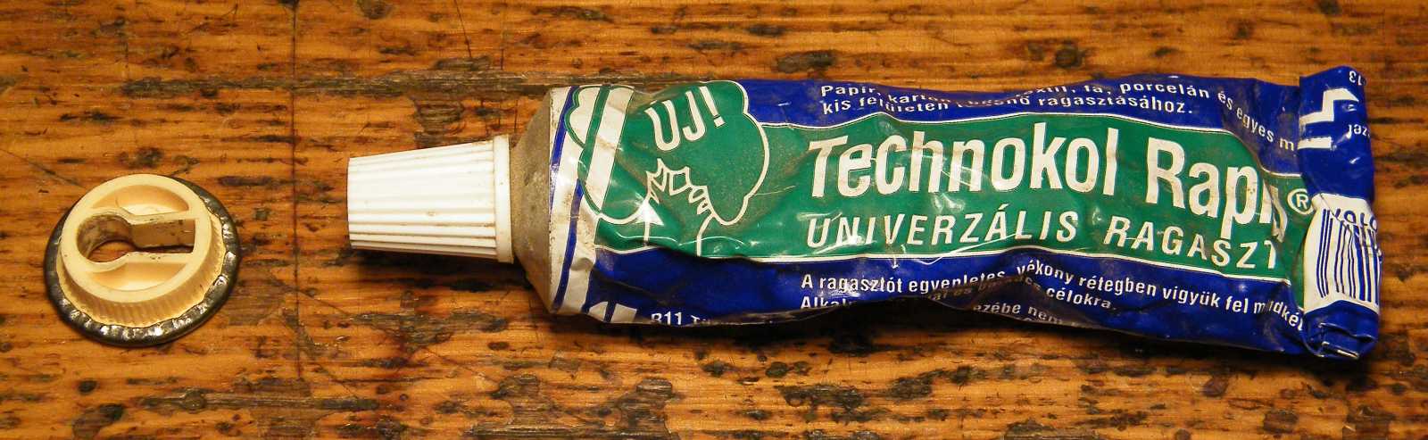 Mikor a polcra felnyúltam a tubusnyi ragasztóért, akkor meglepetéssel vettem tudomásul, hogy bár a mérete és a formája (mármint ez is kerek) úgy nagyjából stimmelt, de ami a kezembe akadt, az nem egy tubusnyi ragasztó, hanem egy foglalatával együtt eltett izzó. Itt aztán úgy elszabadultak a dolgok, hogy a még egy percet sem igénylő munkából úgy egy jó órai szaladgálás kerekedett. |