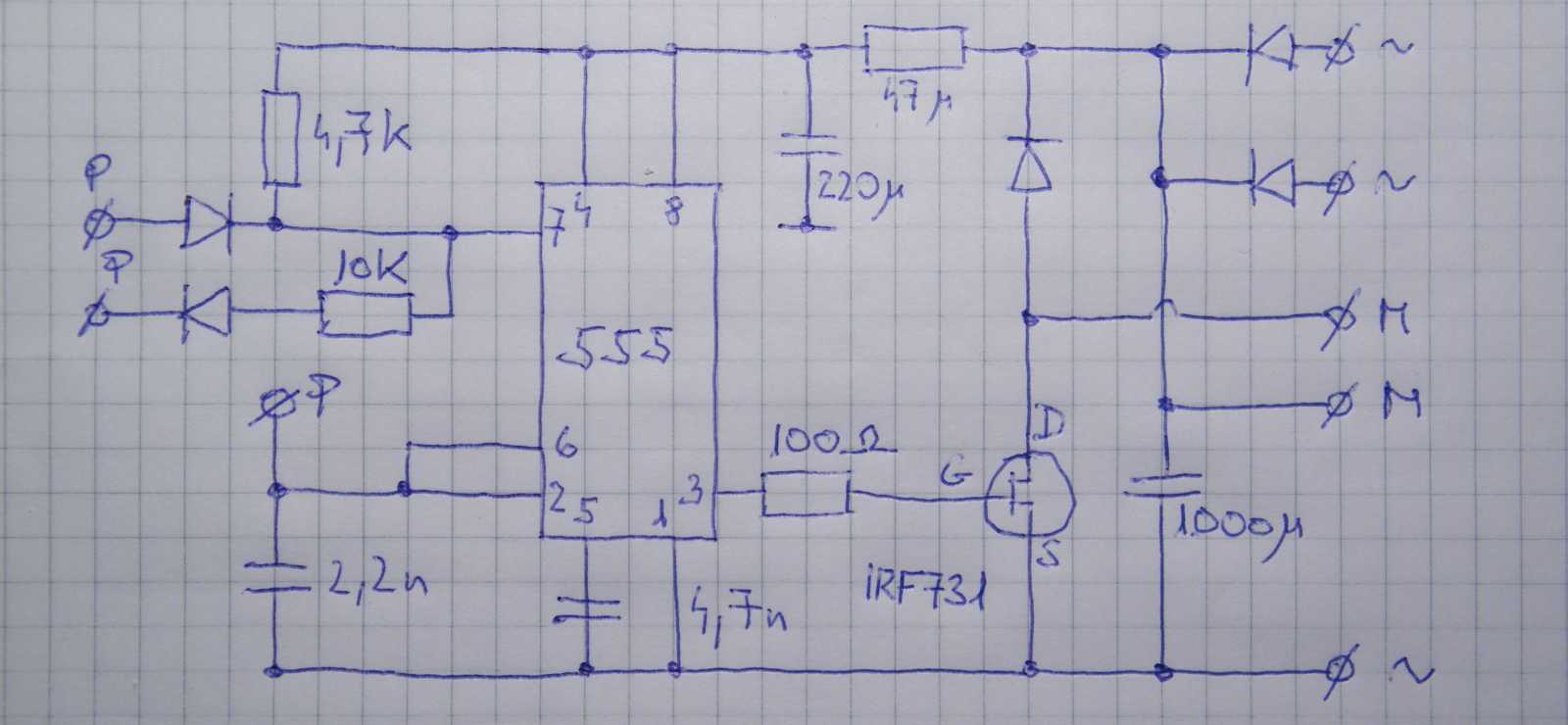 Ettől függetlenül én azért megpróbáltam, de csak odáig sikerült eljutnom, hogy lerajzoltam az 555-ös IC-t alulnézetből, valamint kikerestem a FET lábainak bekötését, mely apróságokat követően azonnal lefordultam a székről. |