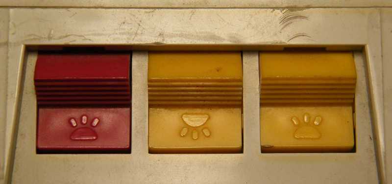 A két jobb oldali üreg annyira tranzisztorhely, hogy teljesen egyértelmű, hogy a lámpa egy másik, értelemszerűen sárga burát is tartalmazó változatánál ide voltak bedugdosva az apró izzót ki-be kapcsoló multivibrátor alkatrészeinek lábai. |