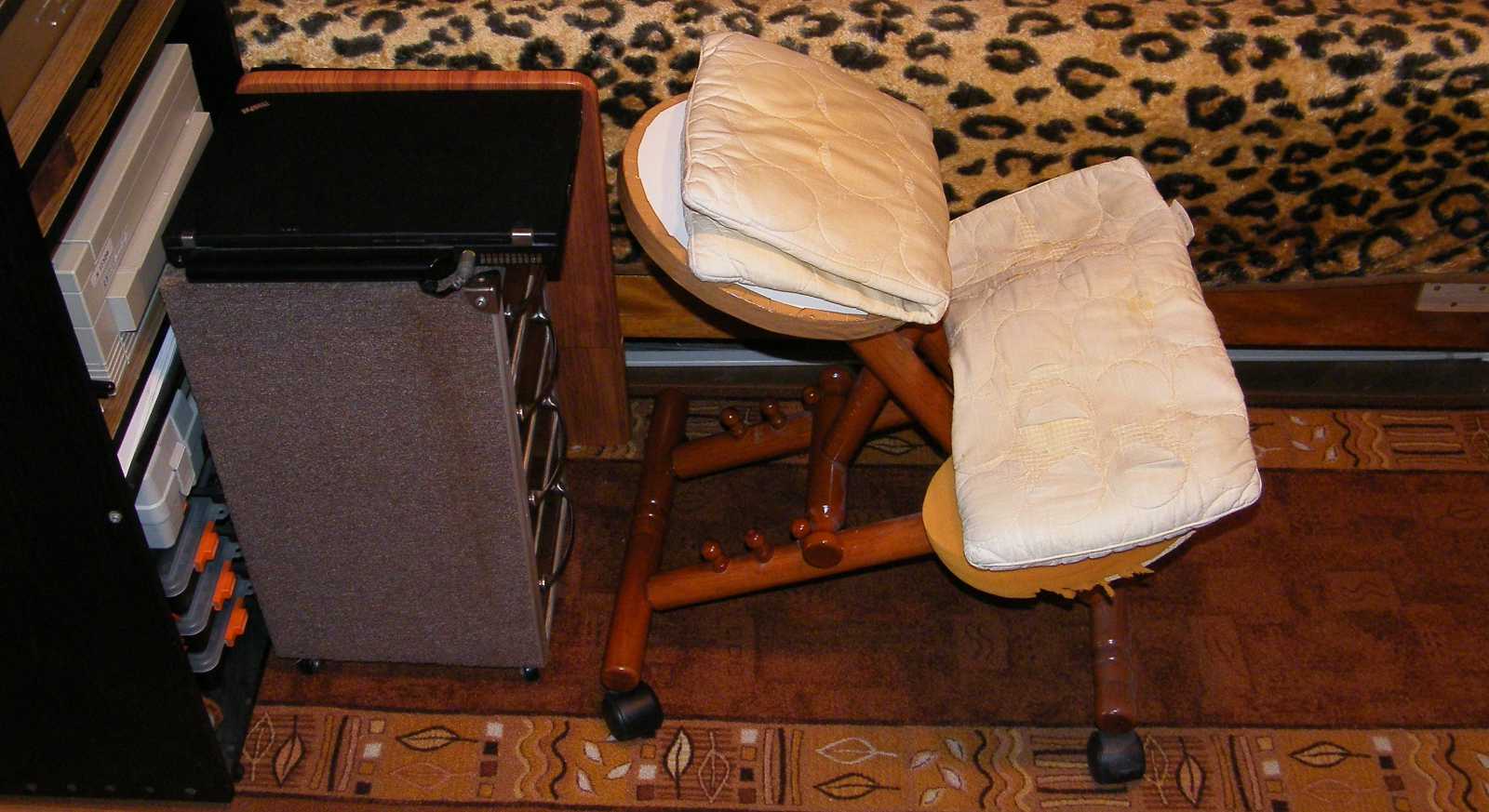 Miközben a térdeplőszékről már elkészült a cikk, az átkárpitozásáról szólóval, épp mint ahogy magával a munkával is, még mindig adós vagyok, pedig amúgy bevált. Mármint sokkal jobb rajta ülni, mint azon a másik széken, amit kihoztam helyette a szobából. A cserét csak azért ejtettem meg, mert a térdeplőszék kerekei nem állnak a helyzet magaslatán. Mármint azok valamiért - a másik székkel ellentétben - folyton elakadnak a parketta réseiben. |
