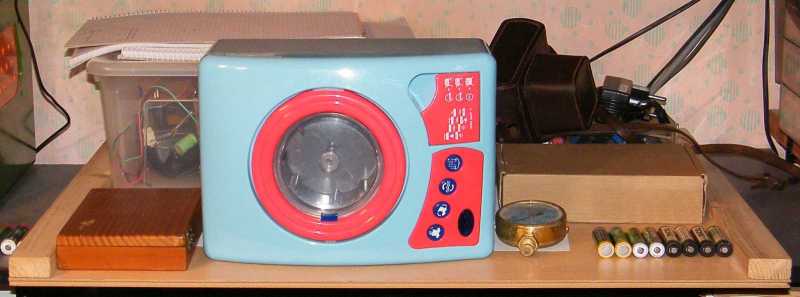 Bár kezdetben csak kettő volt meg a háromból, végül a festékes vödör is előkerült, mégpedig - csodák csodája - az építőanyagos polcról. Hogy a mosógép ne érezze magát egyedül, no meg fogyjanak a kosárból a bemutatnivalók, hoztam mellé egy rézből készültnek tűnő nyomásmérőt is, melynek skálalapja meglepő módon ugyanolyan árnyalatú kék, mint amilyen a mosógép háza. |