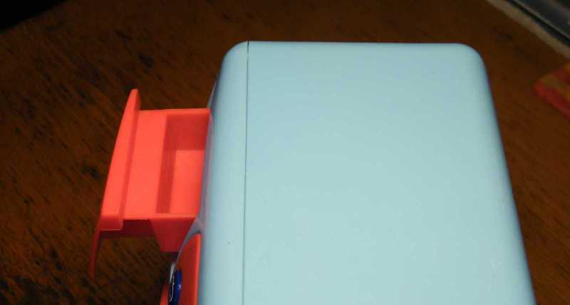 Bár ez csak játék, amit egy gyengécske motor hajt, de attól még van benne biztonsági kapcsoló, nehogy a gyerek nyitott ajtóval indítsa el a gépet, aztán a dobba nyúlva eltörje az ujját. |