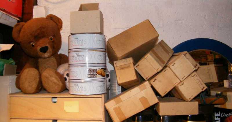 Íme. Hogy a dobozt mégis mi a csudának viszem fel, mikor idelent kell? Nos azért, mert kell rá egy felirat is, különben a Miniplexek soha többé nem kerülnek elő. Hogy van a pincében átlátszó cellux, kés, olló, toll, és még biankó, vagyis üres címke is, az azért nem eredményezte a rózsaszín doboz pincebéli feliratozását, mert az asztal az adott pillanatban még olyan szinten volt elbarikádozva, hogy képtelenség lett volna rajta bármiféle munkát végezni. |