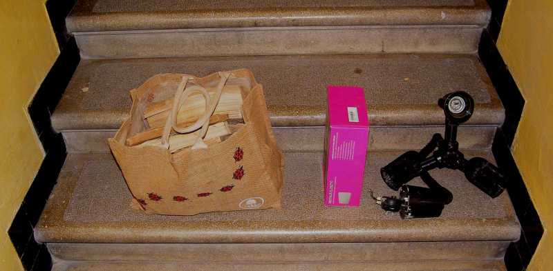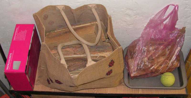 Mivel a reggeli begyújtáskor úgy láttam, hogy fent már csak egy napra elegendő aprófa van, így abból is raktam a szatyorba. Hogy a katicás szatyorba nemcsak aprófa került, annak oka az, hogy annyi nem volt előre aprítva, hogy teljesen megtöltse. Vagyis ha valamelyik nap nem szeretnék belefutni az aprófa hiányába, akkor lehetőleg még ma vissza kell jönnöm a pincébe, aprítani egy szokásosan hatalmas adagot, mikor is egy füst alatt a már felmatricázott rózsaszín dobozt is visszahozhatom. Ha még a lámpa maradványai is velem fognak jönni, az szerintem maga lesz a csoda! Az meg pláne, ha még a bicaj is visszakapja a hátsó lámpáját! |