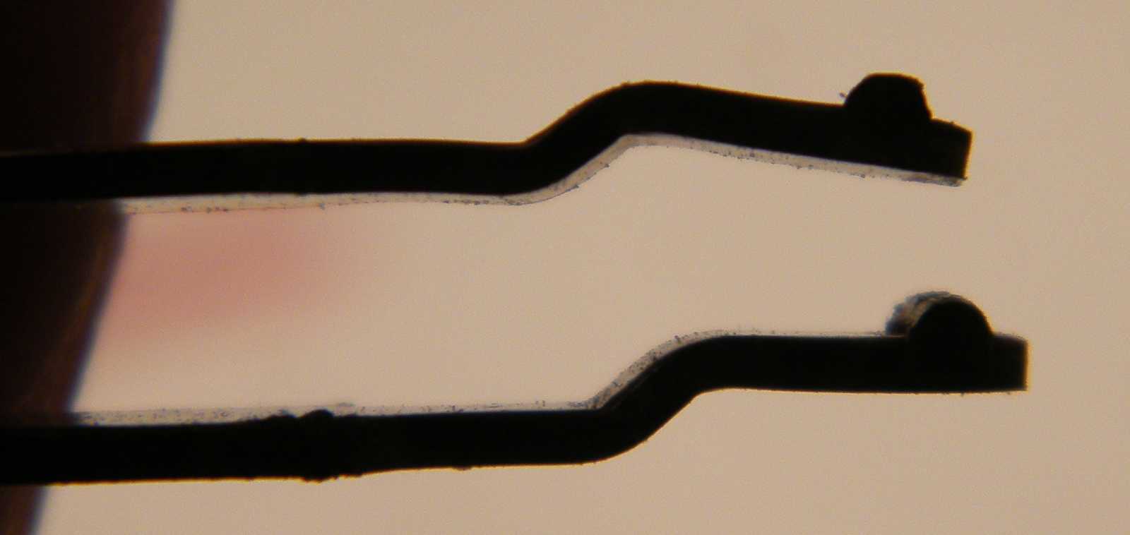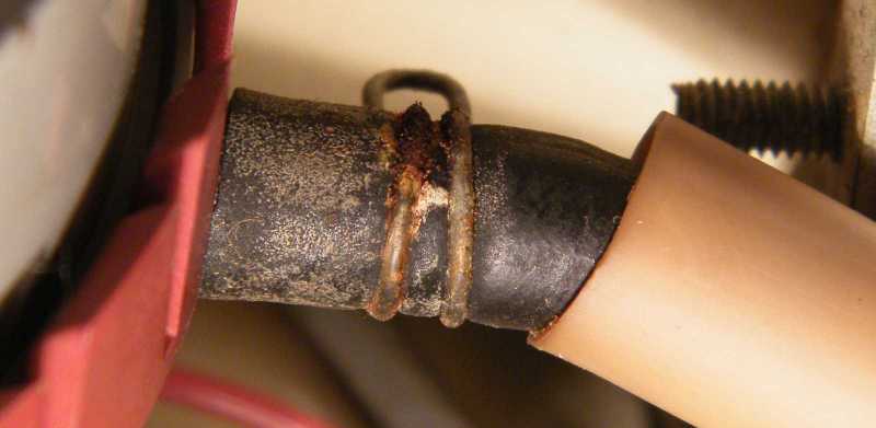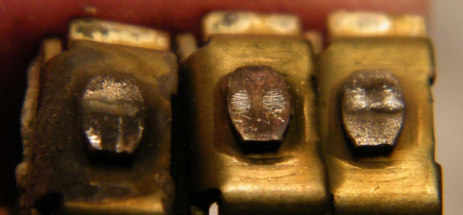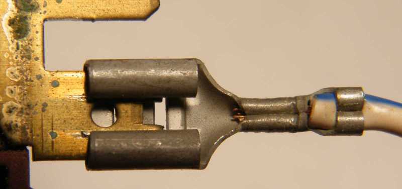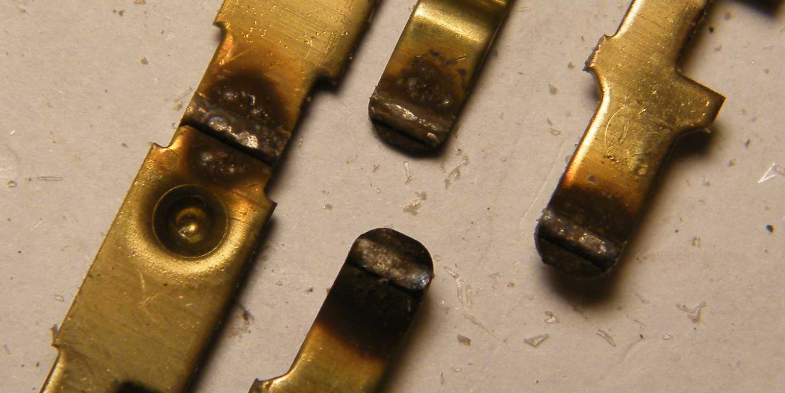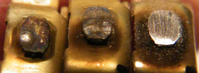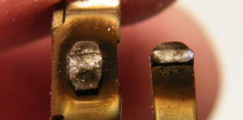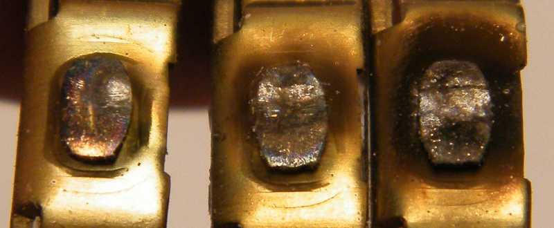 Az ok igen nagy valószínűséggel az átmeneti ellenálláson keletkezett hő volt, ami idővel meglágyította az anyagot. Ennek eredménye kitűnően látszik az egymásmellé helyezett érintkezőkön. |