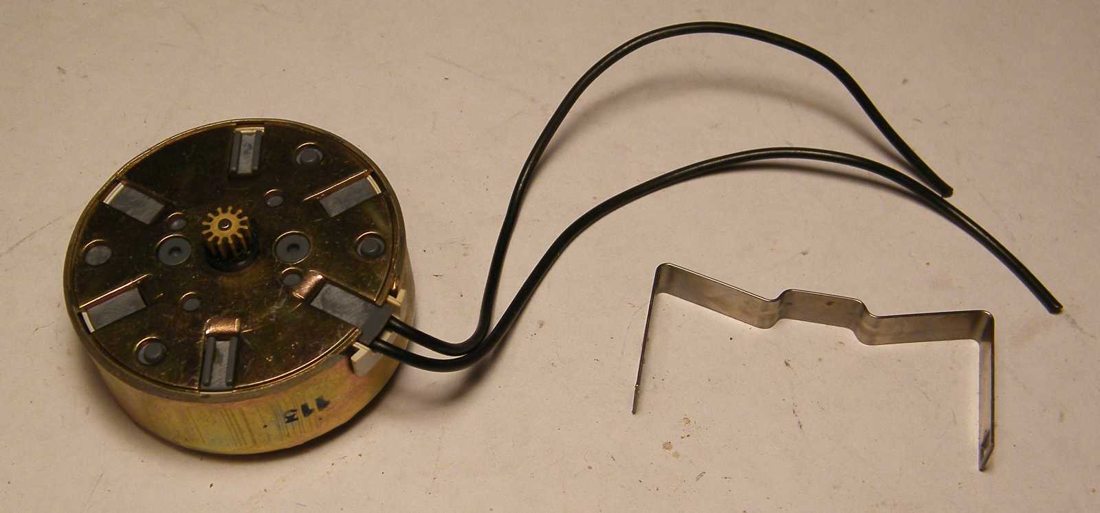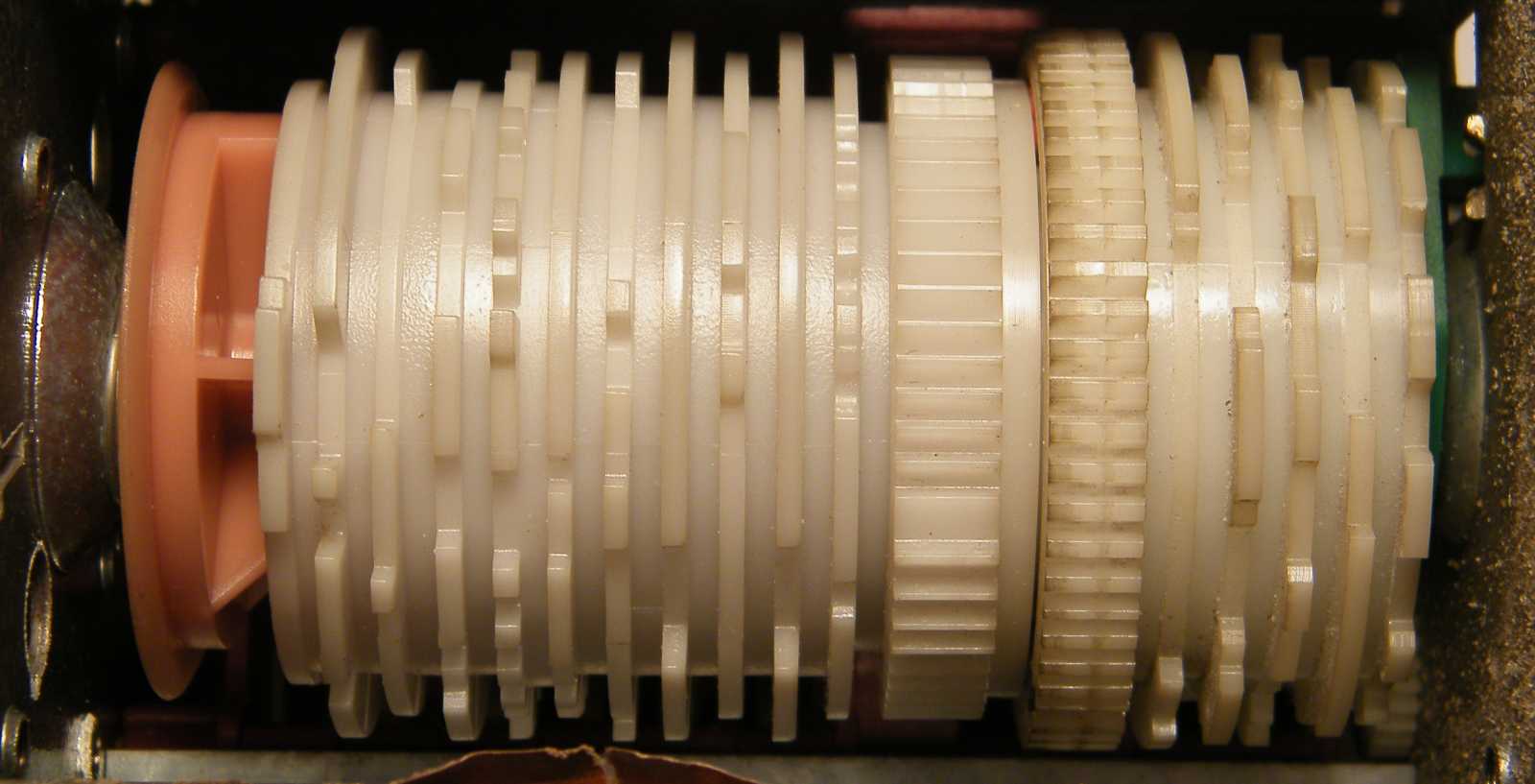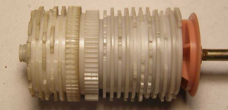 A balra látható kerek valami a programhengert forgató motor, míg a jobbra látható elektromágnes egy olyan kuplungot működtet, ami meg tudja állítani a vezérlőhenger forgását. Már ha - mint megannyi mást - ezt is el nem néztem... |