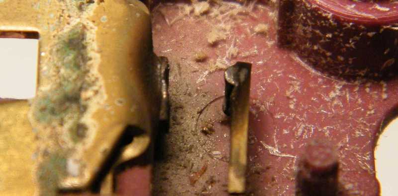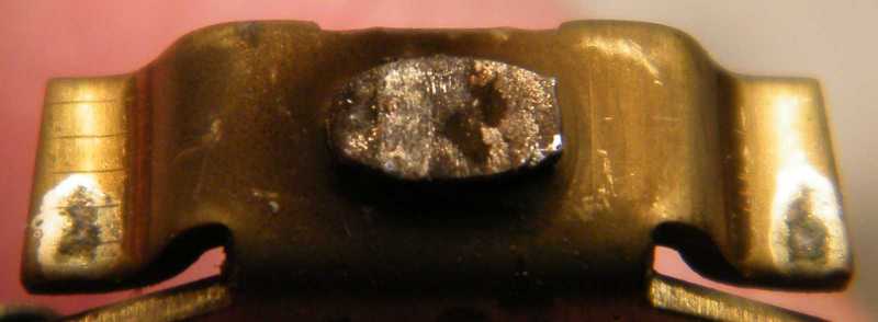 Az előző képen látható érintkezőt közelebbről megnézve, azon a kapcsolókar érintkezőjétől eltérő helyen is (lásd balra) látható egy fekete korommal körbevett szikranyom. Ehhez vagy oda kellett valaminek keverednie, vagy a kapcsoló mondjuk valami induktív feszültségtüske miatt áthúzott. |