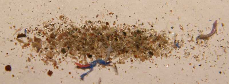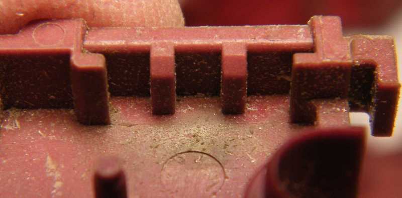 Ez a kép két egymásra helyezett kapcsolómodult mutat. Mivel a balra lent látható lyukban valaha egy fogaskerék műanyag tengelye forgott, ahol is a többi helyszínnél sokkal több a por, ezért elképzelhető, hogy a por egy részét a mozgást végző alkatrészek kopása termelte. |