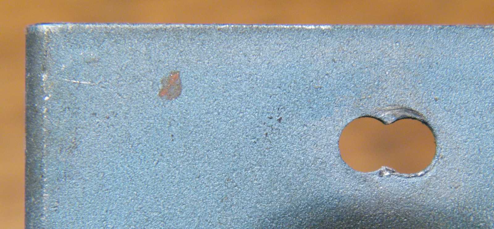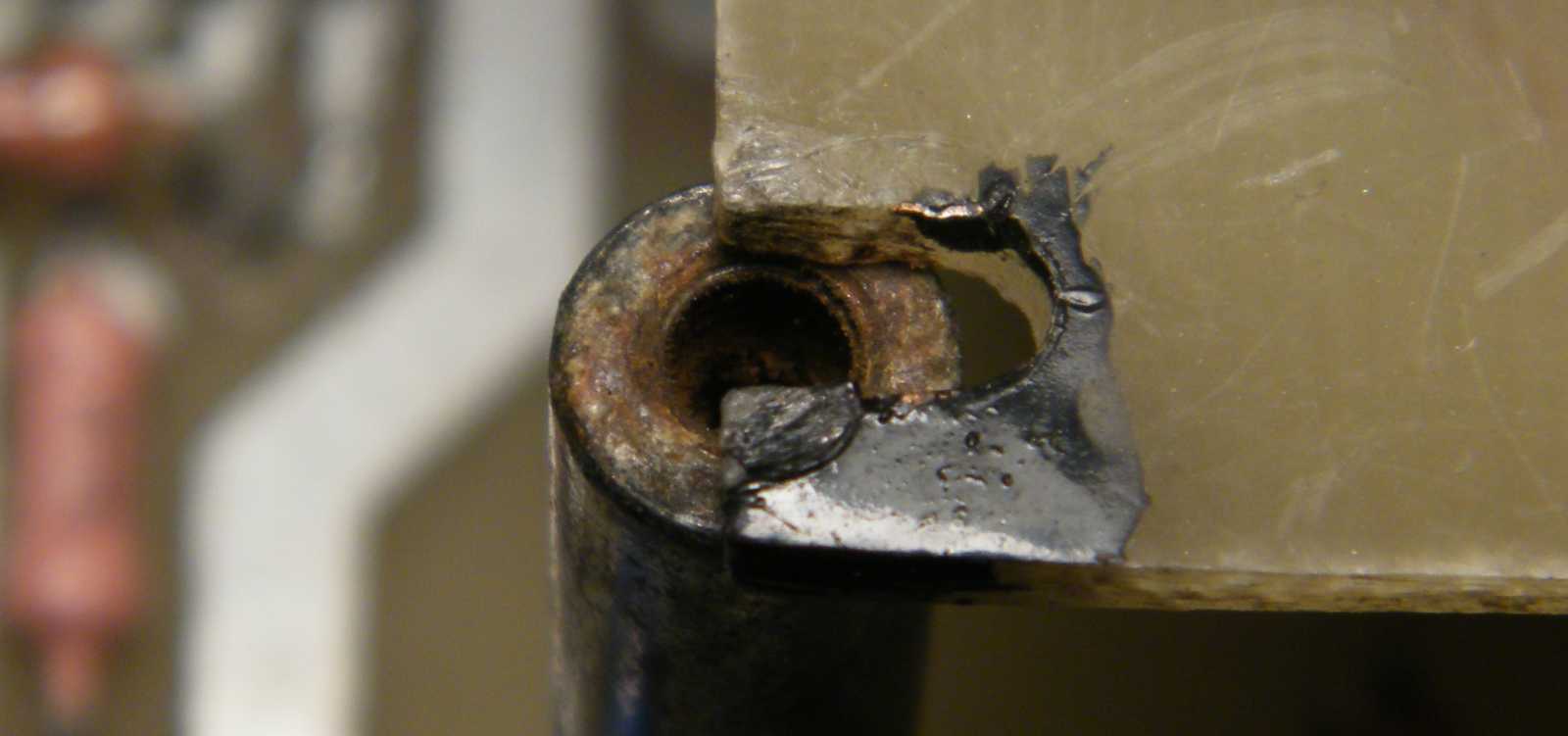 Az előbb még ebből a pontból kiálló, konkrétan a menetbe épp csak egy kicsit belekapó csavarban talán nem is az volt a fura, hogy ki lett tekerve, hiszen erre szükség volt a kijelző panelja alatt található osztóhoz történő hozzáféréshez (no nem nekem, hanem még az előző mesternek), hanem az, hogy a lyuk mélyén nem annyira menet van, mint inkább egyszerűen csak rozsda. Mivel a műszerben sehol sincs nyoma víznek, ez valószínűleg egy már eleve rozsdásan beépített alkatrész volt. Ami mindezeken felül is fura, hogy mégis hogyan lehetett az eredeti csavar betekerve, és még fekete festékpöttyel rögzítve is, ha nincs is a lyukban menet? |