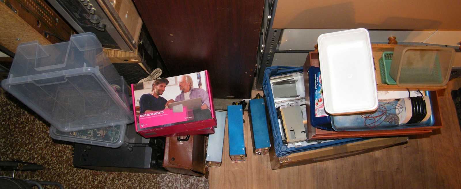 A pincébe nem azért szaladtam vissza, hogy mindhárom műszer egymás mellé kerüljön (lásd őket a lomkupac közepén), hanem inkább azért, hogy folpackba csomagoljam őket. Ezt a tervemet az a tény torpedózta meg, hogy a nem konyhai, hanem a bútorcsomagolásra való vastag hengert már megint nem találtam meg. Mármint az már a múltkor sem volt ott, mint ahol azt tartani szoktam, ezért szörnyűségesen emelkedett szintű letolásban részesítettem magamat. |