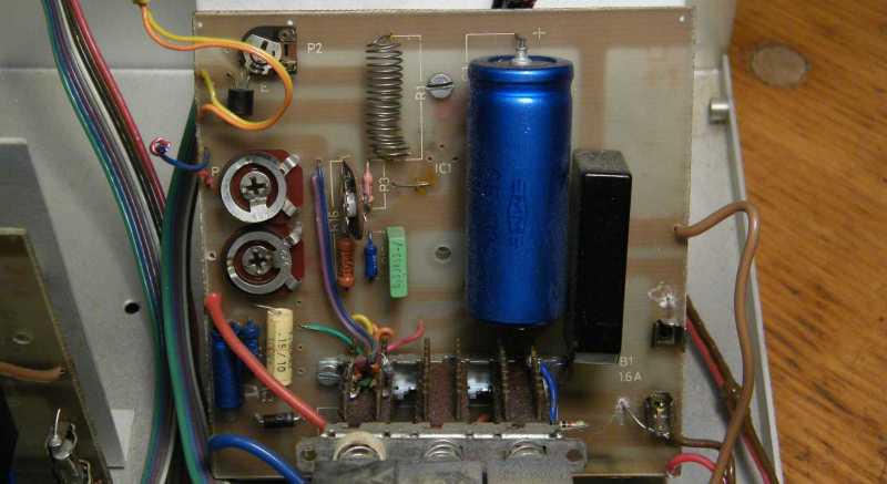 Valaha (értsd még a 80-as években) labortápot alapvetően vagy egy teljesítménytranzisztorral megfejelt 723-as stabilizátorból volt szokás építeni, vagy egy négyes műveleti erősítő felhasználásával. Ez valami harmadik út lehet, mert nemhogy IC nem látszik a panelen, de még tranzisztorból is csak egy lapul a bal felső sarokban. A fekete téglapap a diódahíd, a kék henger a puffer elkó, a tekercs pedig az áramfigyelő ellenállás. |