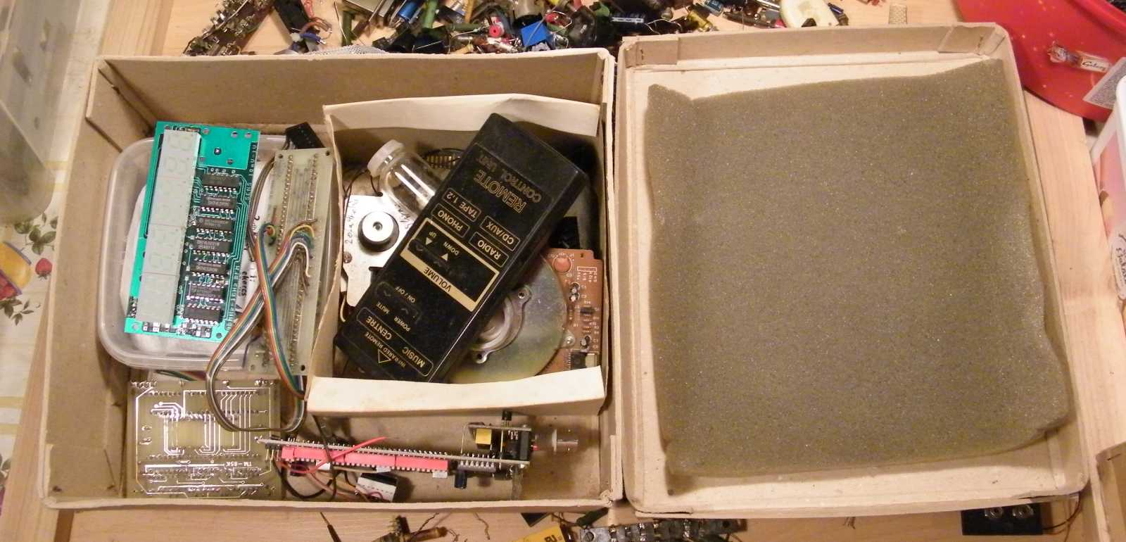 Mikor a pincébe aznap már harmadjára mentem le, a dobozok feliratait pedig már ki tudja hányadszorra böngésztem végig, az egyik doboz tetején kiszúrtam egy az eredeti tartalomra utaló nevet kiegészítő "elmaradtak" szót. A dobozban ezen felirat értelmében nemcsak a ma keresett, de a másik, természetesen még szintén bedobozolatlan frekvenciamérő panelja is ott volt, mégpedig a infra-távirányítós hangerőszabályzóhoz még a 80-as években összegyűjtött alkatrészekkel együtt. |
