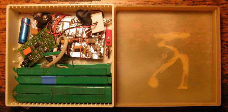 Mármint egy dobozt kinyitni az alkatrészkupac tetején is lehet. Miközben a fiókba rejtett papírdobozban a középhullámú jelgenerátorhoz összeharácsolt alkatrészek hevernek, addig a kerek műanyag társában azok az oszcillátorokat tartalmazó panelek, melyeket még a wobler fejlesztésekor készítettem. Az épp nagyban keresett frekvenciamérő persze sehol. No de semmi baj, hiszen ez még csak az elsőnek kinyitott doboz volt. |