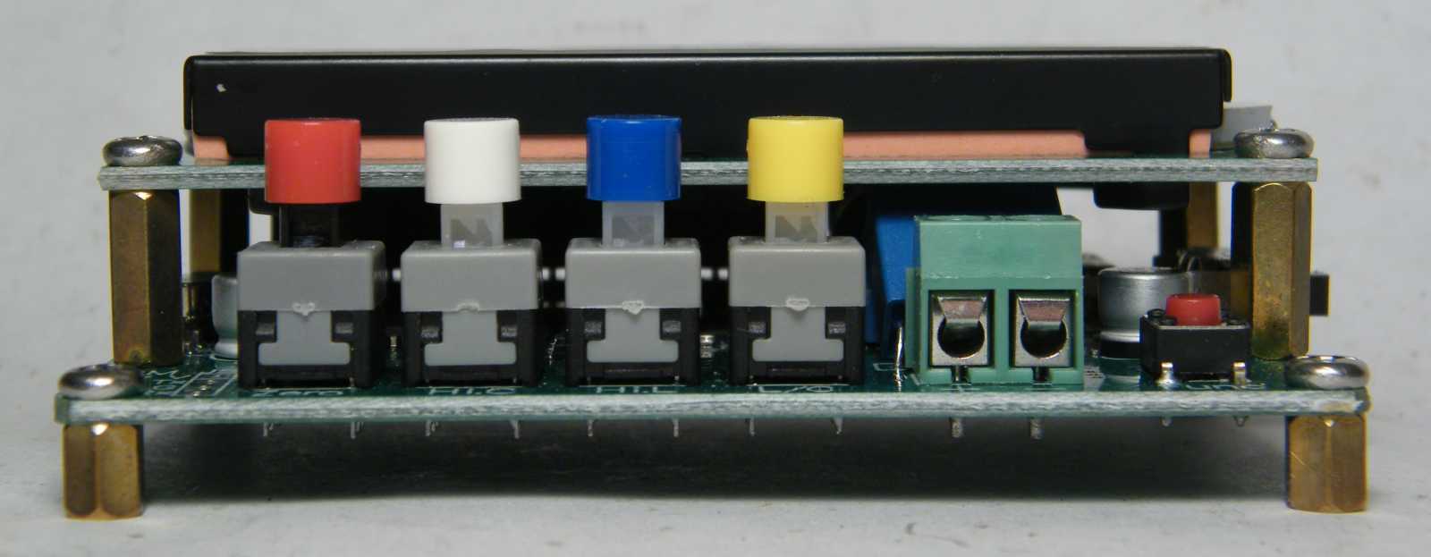 Egy másik, talán szintén járható út az lenne, ha az alsó panelben található magasabb alkatrészeket kiszedném, alacsonyabbra cserélném, esetleg áttenném a panel alá, majd a hosszú távtartókat a rövidekkel megcserélve, a kijelző egy síkba kerülne a nyomógombokkal. |