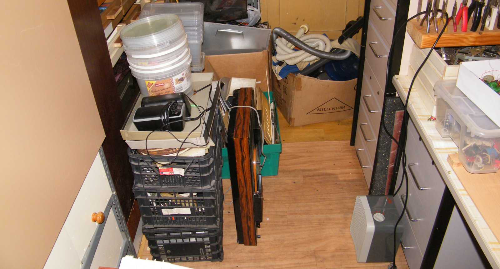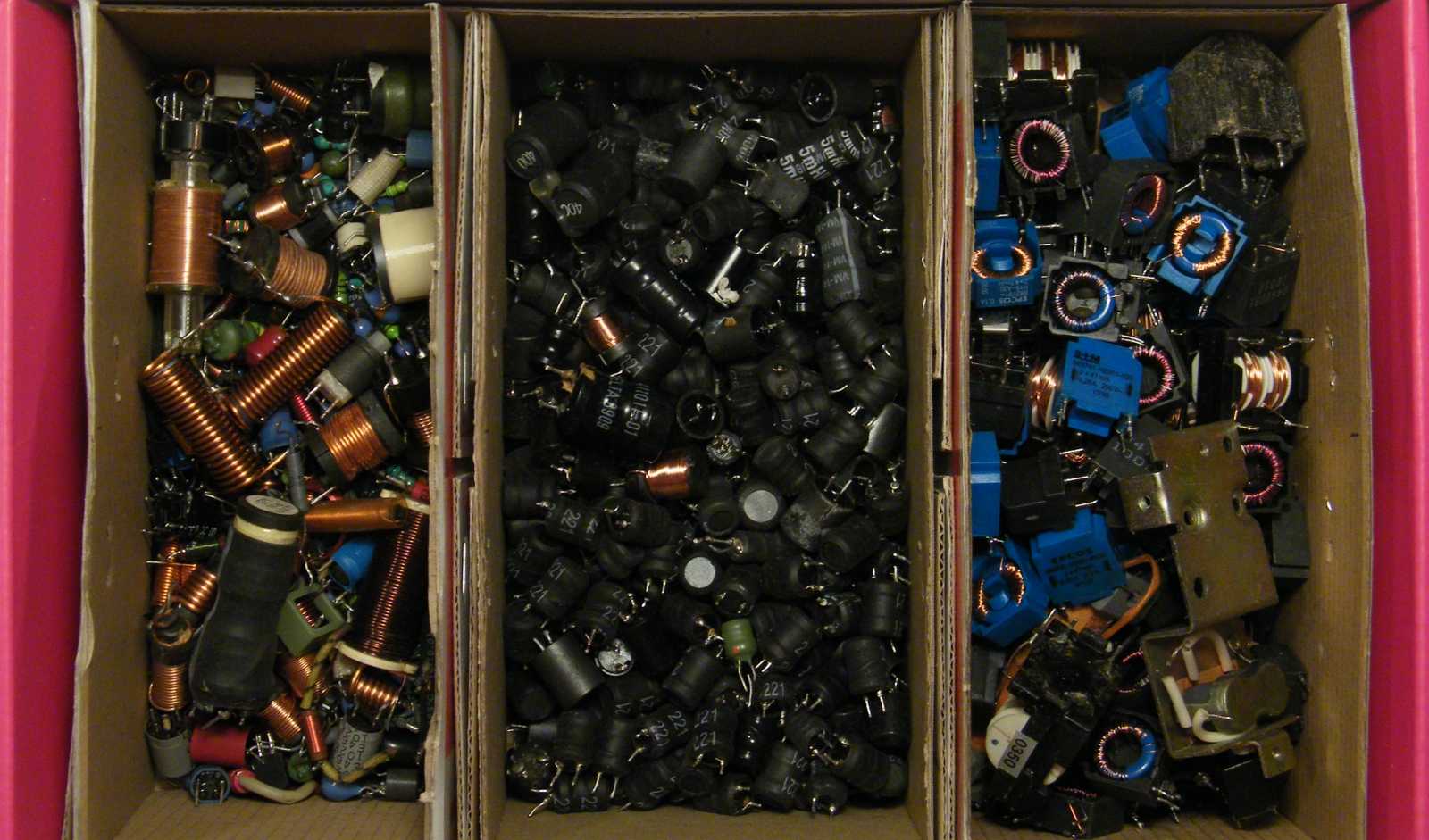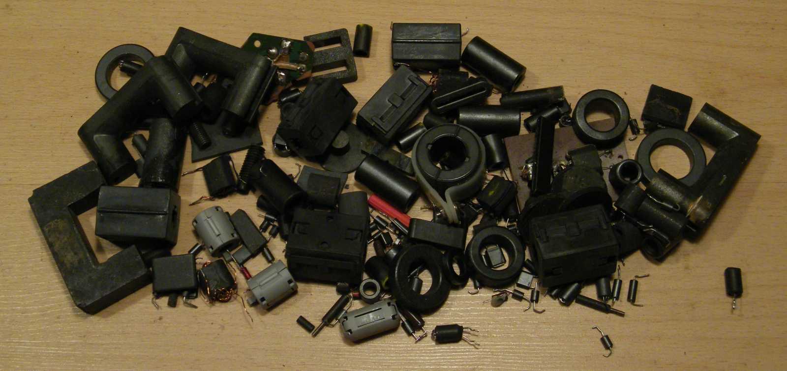 Miközben az induktivitások megvalósításához előtúrt vasakat az asztalnál ülve rendezgettem, idővel kezdett hiányérzetem lenni. Mármint annak tekintetében, hogy a gyűrűvasaim AL értékét még nem mértem le. Kisvártatva már magukat a gyűrűvasakat hiányoltam, aminek az lett a vége, hogy lejöttem hozzájuk ide a pincébe, ahol is ha magamat azért nem is (de csak mert a kialakult kuplerájt illetően óvatosságból inkább nem néztem körbe), de a vasmagos dobozt könyörtelenül kiborítottam. |