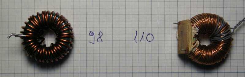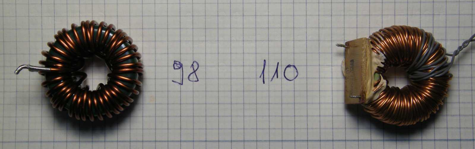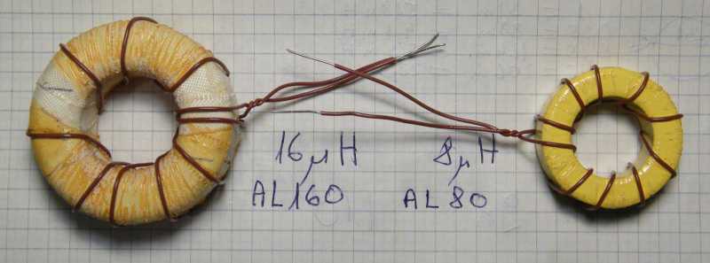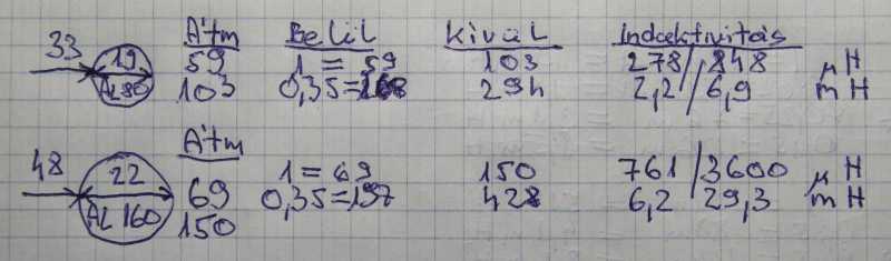 Miközben a balra látható gyűrűmagra tekercselt meneteket egyszerűen csak megszámoltam, majd az eredményt beadtam a képletbe, addig a jobbra láthatóra feltekertem a szokásos 10 menetet. A középen látható számok már az AL értékek. |