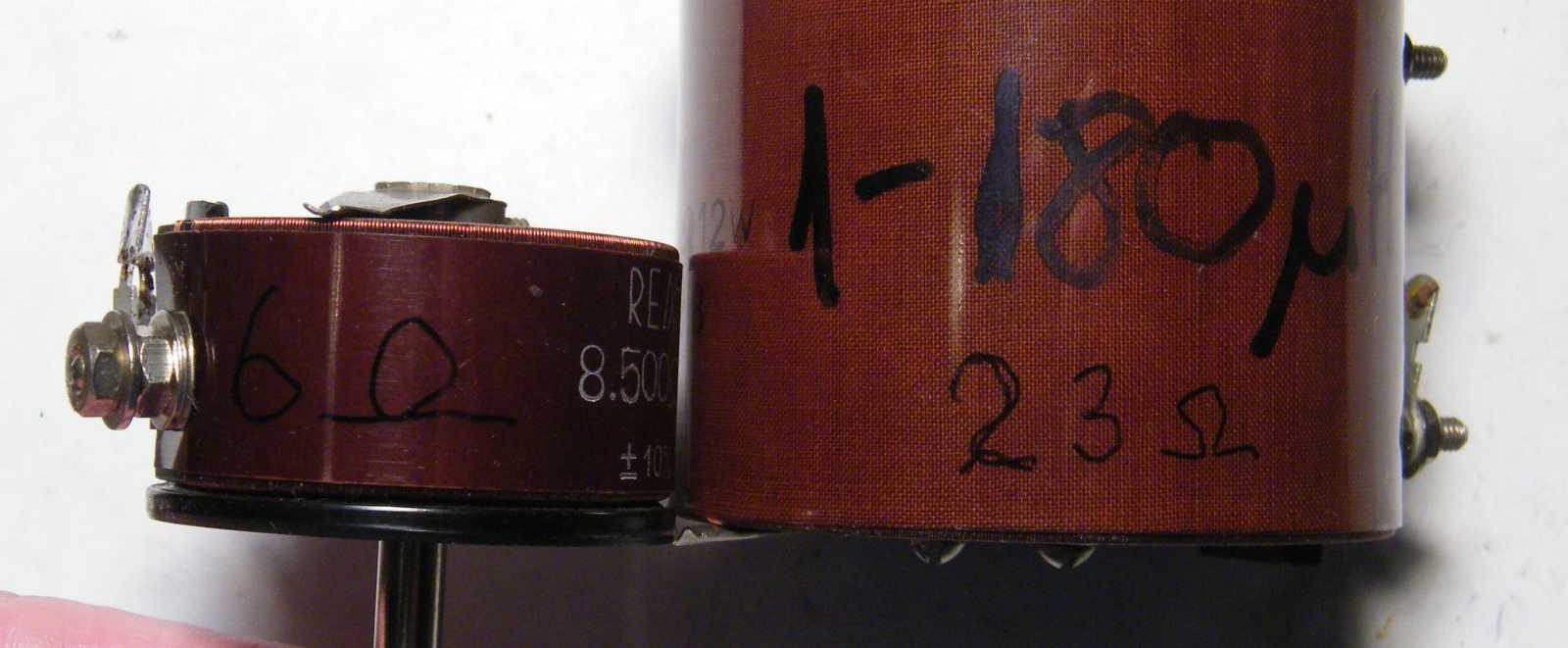 Mint inkább konkrétan azért, mert bár az induktivitásukat már rájuk írtam, az egyenáramú ellenállásukat azonban még nem, amit azonnal pótoltam. A kisebbik variométer a rátekert kevesebb huzal okán mindössze 6 ohmos, míg a nagyobbik 23 Ω-osra sikeredett. Ezek ketten akár mint huzalpotenciométer is használhatók. |
