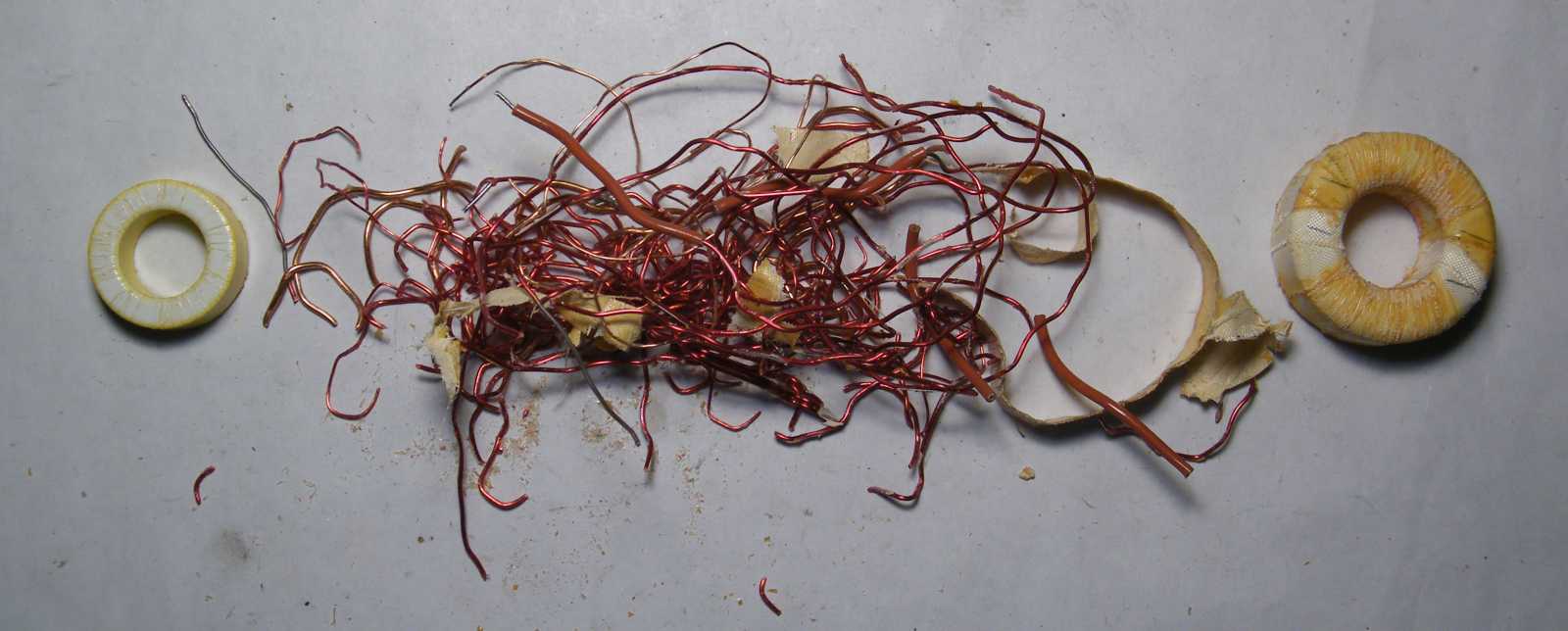 Mivel a csiszolással tönkretettem, így szegény tekercselőhuzalon nem volt mit megmenteni. Mármint szívfájdalom nélkül vágtam le a gyűrűről csípőfogóval. No nem mintha máskor megülné a lelkemet a rombolás... |