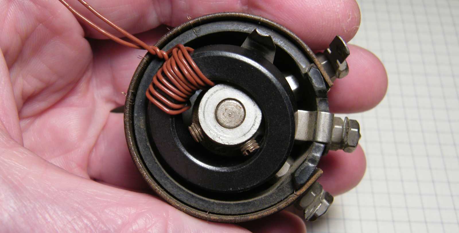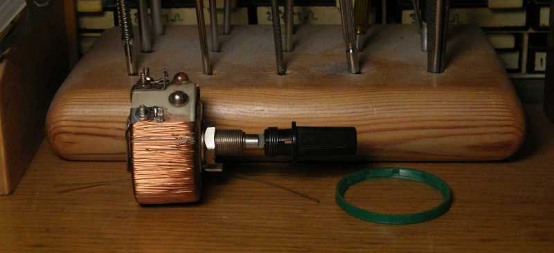 Konkrétan valami olyasmit találtam ki, hogy a tekercs nemcsak a gyűrűvason lesz, hanem az eredeti helyén is, a vasmag rögzítésének módjába azonban az összes kézközelben lévő mechanikát illetően olyan szinten sikerült belezavarodnom, hogy ha örökre nem is, de aznapra ezt az elképzelésemet inkább feladtam. |