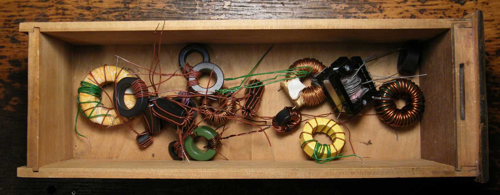 Ebbe a másik tekercses dobozba csak azért néztem bele, hátha akad benne egy csomó, már eleve kész tekercs (szinte kivétel nélkül azok vannak benne), melyek felhasználása megkönnyítené az induktivitás dekád elkészítését. Egy kicsit ugyan billegtem a doboz előtt, de aztán viszonylag gyorsan sikerült az ebbe az irányba történő eltérülésről lemondanom. |