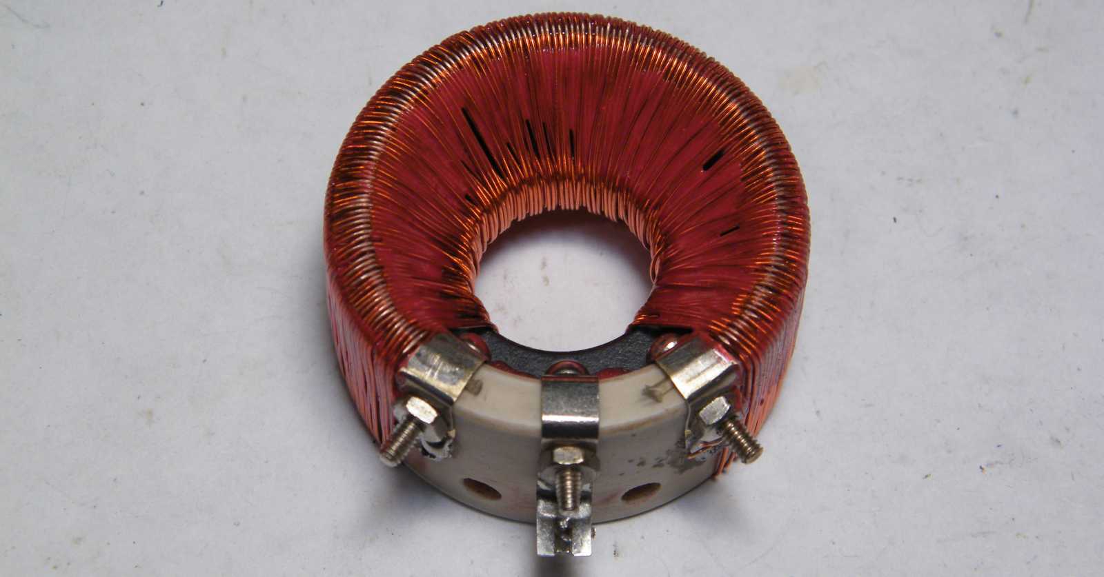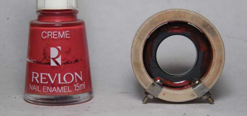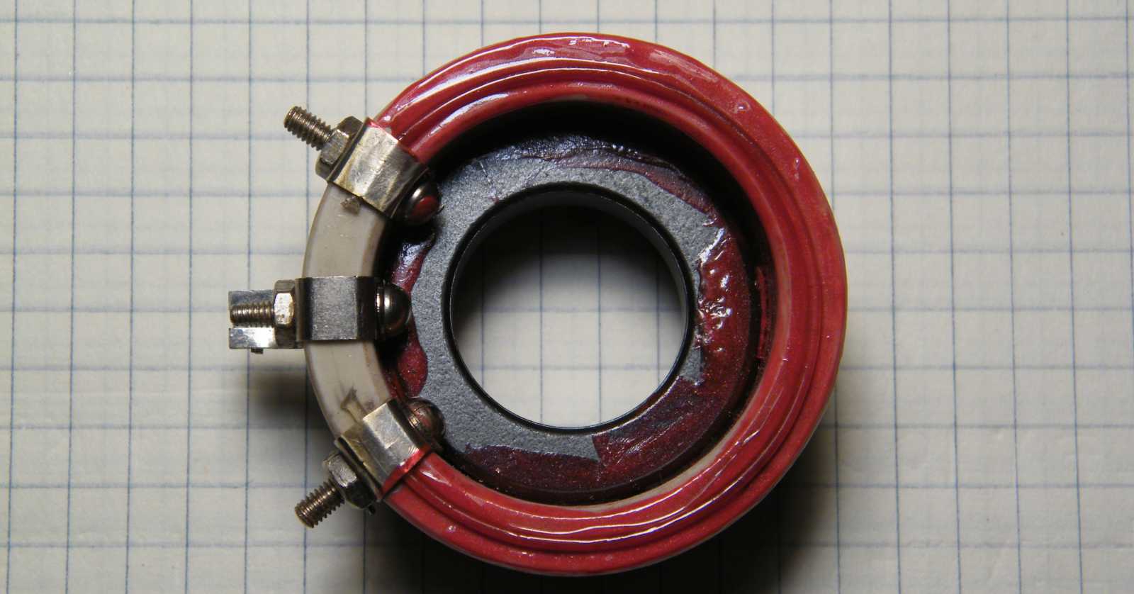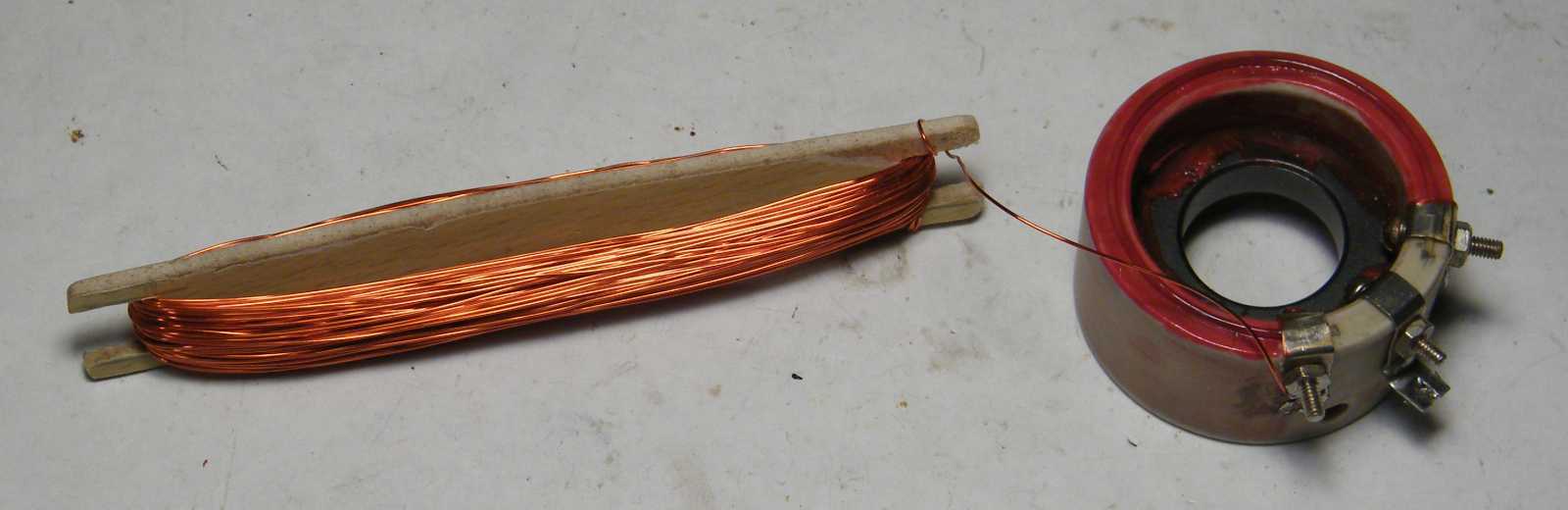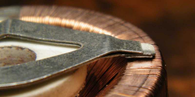 Az alátétek között talált gyűrű a kitűzött célra mondhatni természetesen csak majdnem jó. Ráadásul nemcsak méretre kicsi, de még hiányzik is róla az innen nézve felfelé mutató él, ami a tekercselőhuzalt a síkból kiemelné. |