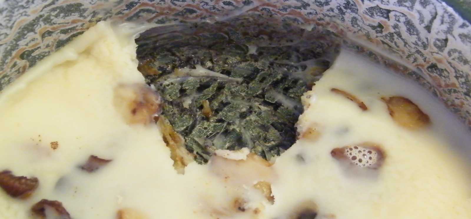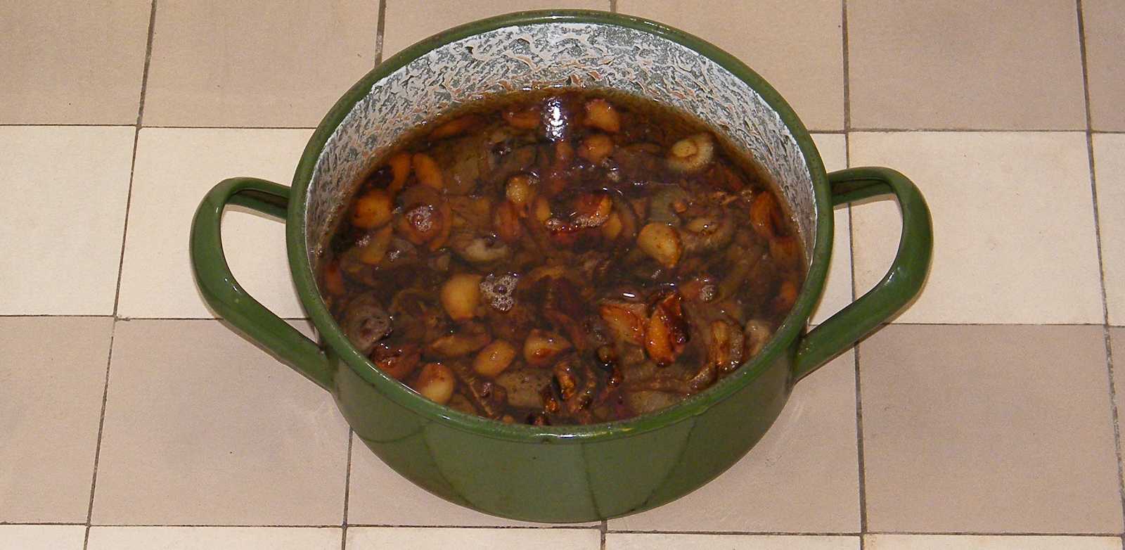 Majd ráborítom a serpenyőből a zsírt, s leteszem a lábost a sarokba hűlni. Ez az étel, bár nagyon úgy néz ki, mintha már ehető lenne, de még nem az, ez ugyanis egyértelműen hidegen fogyasztandó. |