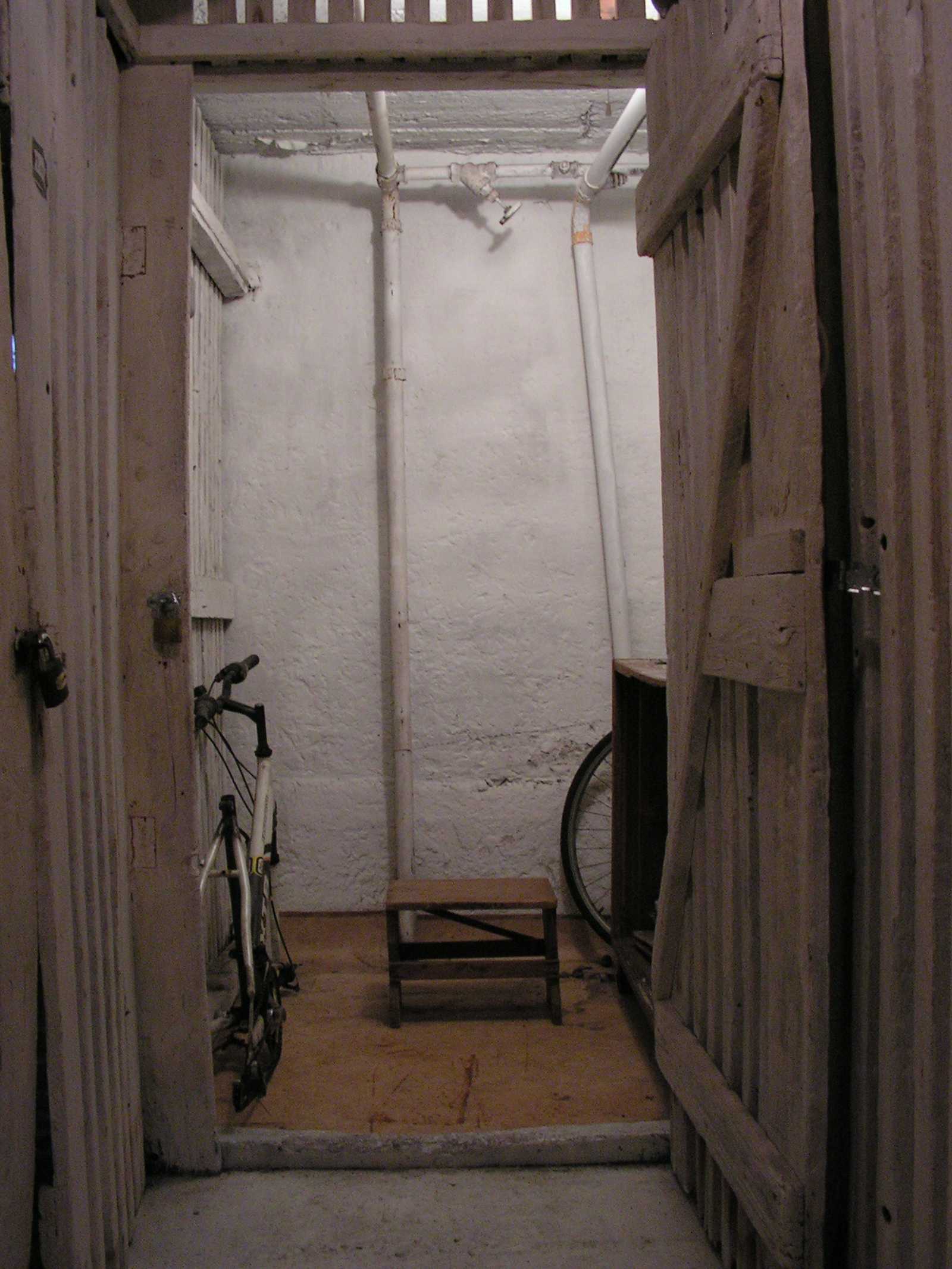 Ez a kép közvetlenül a bejáratot ábrázolja. A fehér sáv a küszöb, az alulról belógó valami pedig a cipőm orra. Vagyis simán beférek, épp csak a zsebem széle akad bele folyton a fűnyíró vázába. |