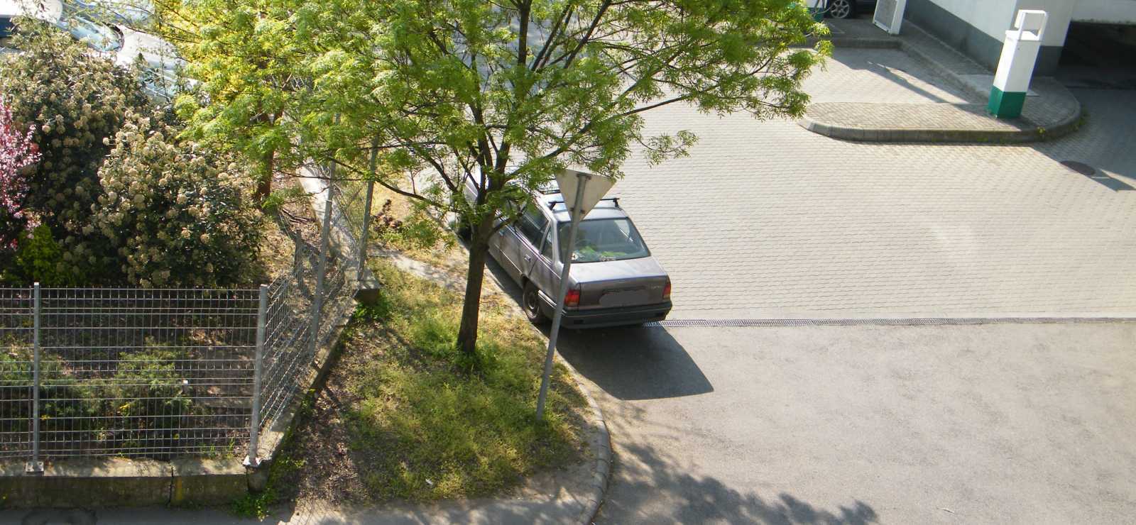 Hogy a kötelező haladási irány táblát benövi a zöld, s ezért nem igazán látható, az ugyan ad rá némi okot, hogy valaki a kútra innen felőlünk, vagyis szemből behajtson, azt azonban nem magyarázza meg, hogy a kihajtók miért nézik a benzinkút kihajtóját parkolóhelynek. |